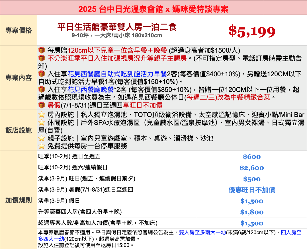 註:依房型人數限多一位入住,120cm以下無須收加人費用,120cm以上須酌收加人費用。