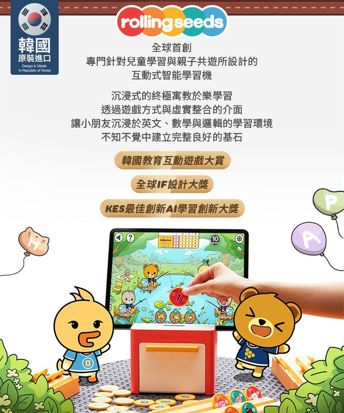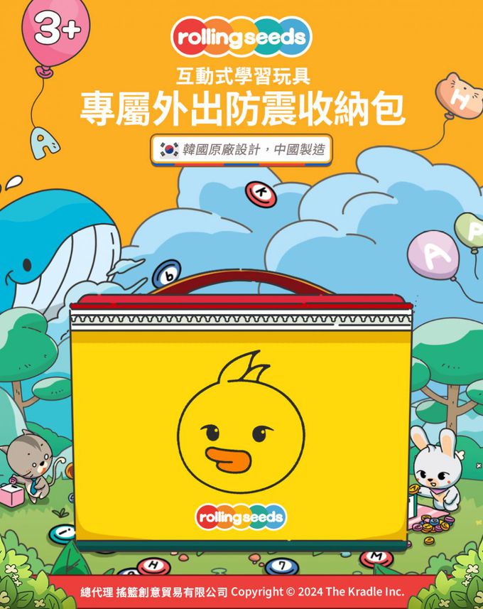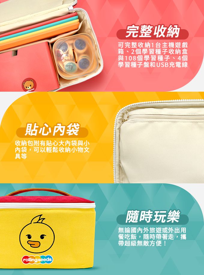 。韓國Rollingseeds互動式學習玩具組專屬外出防震收納包。可完整收納1個主機遊戲箱、2個學習種子收納盒(包含108個學習種子)、4個學習種子盤和USB充電線1條。收納包附有一個貼心大內袋,可以輕鬆收納小物文具等。動物角色主題鮮明設計,質感非凡。無論國內外旅遊或外出用餐吃飯,隨時帶著走,攜帶超級無敵方便!。尺寸:30 x 20 x 18.5 cm。韓國精心設計, 中國精工製造