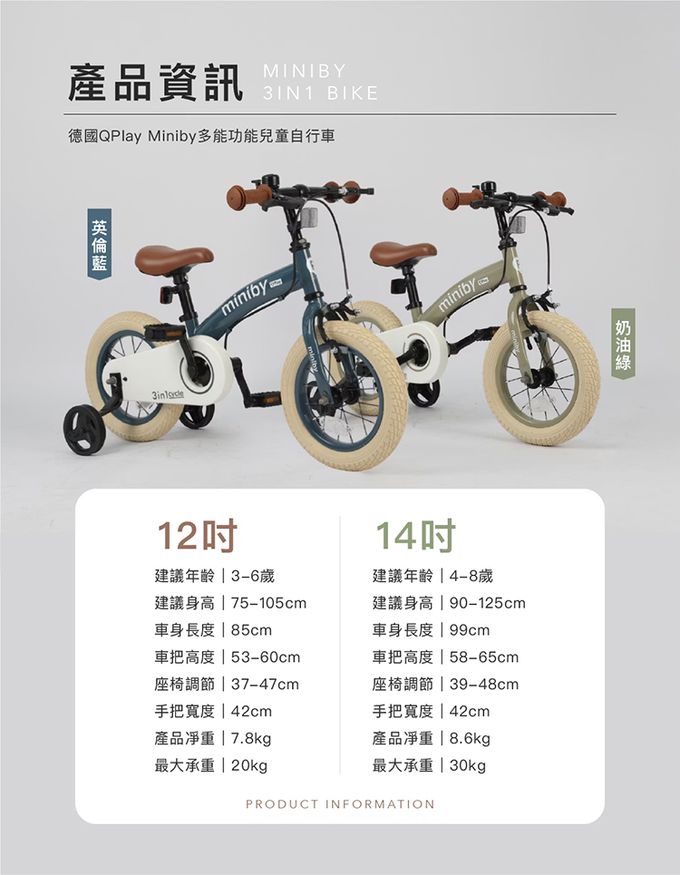 注意事項:【商品規格】 適用年齡:4-8歲 適用身高:約 90-125公分 最大承重:30公斤 主要材質:鐵、塑膠(PP、TPE) 商品尺寸:車身長約99cm;車把高度58-65公分;座椅高度39-48公分 產品淨重:約 8.6公斤 產地:中國 商品檢驗標識號:(I)C2-0486024 ~ (I)C2-0486423 【注意事項】 ● 請在成人監護下使用本產品。 ● 本產品不適用於4歲以下之兒童。 ● 使用前,請詳閱說明書,必需由成人組裝。 ● 使用本產品請穿載防護裝備如安全帽、護膝、護肘、鞋子等。 ● 使用前請確認各零件是否正確組裝,所有鎖定裝置必須鎖緊咬合。 ● 為避免嬰兒或兒童產生窒息之危險,請於拆卸後立即將此塑膠袋銷毀或遠離嬰兒及兒童。 ● 請勿自行更換零組件,以避免使用時發生危險,並依照使用說明書之建議,維護及保養零組件。 ● 本產品最大承重30公斤,請選擇適合乘騎者尺寸之兒童自行車,請勿進行雙人(以上)乘載,以免發生危險。 ● 請勿在公共道路上、易翻車場合、高低不平、樓梯、自動扶梯、水池、碎石路面、斜坡、坡道等危險場所使用。 ● 使用本產品前請先檢查自行車各部位,如座墊高度及手把豎桿有無鬆脫或超出安全準線,胎壓、煞車及其他零件是否鬆脫或損毀。