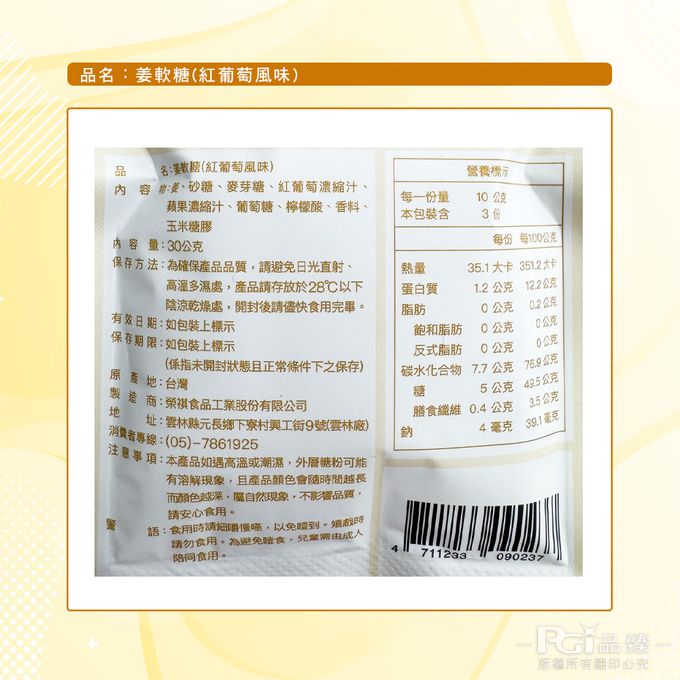 成分:蔓越莓:姜、砂糖、麥芽糖、蔓越莓濃縮汁、蘋果濃縮汁、葡萄糖、檸檬酸、香料、玉米糖膠 芒果:姜、砂糖、麥芽糖、芒果泥、葡萄糖、檸檬酸、香料、玉米糖膠 鳳梨:姜、砂糖、麥芽糖、鳳梨濃縮汁、葡萄糖、檸檬原汁、檸檬酸、香料、玉米糖膠 金桔:姜、砂糖、麥芽糖、金桔原汁、葡萄糖、檸檬原汁、檸檬酸、香料、玉米糖膠 百香果:姜、砂糖、麥芽糖、百香果原汁、葡萄糖、檸檬酸、香料、玉米糖膠 蜂蜜檸檬:姜、砂糖、麥芽糖、蜂蜜、檸檬原汁、金桔原汁、葡萄糖、檸檬酸、香料、玉米糖膠 紅葡萄:姜、砂糖、麥芽糖、紅葡萄濃縮汁、蘋果濃縮汁、葡萄糖、檸檬酸、香料、玉米糖膠