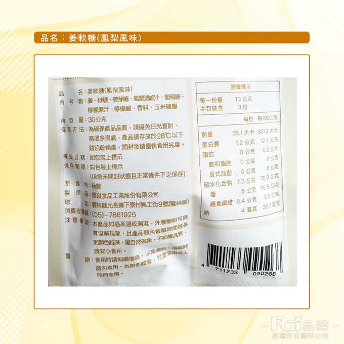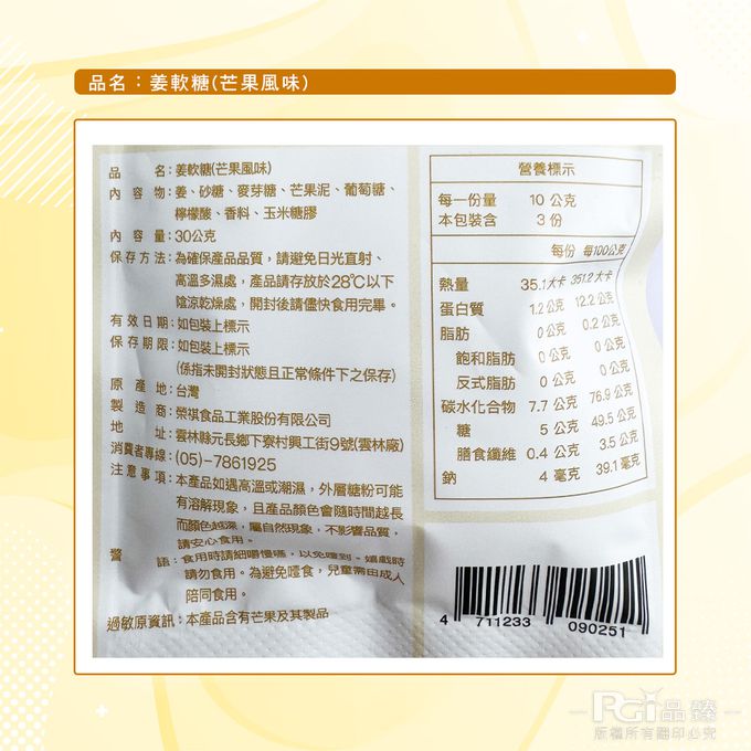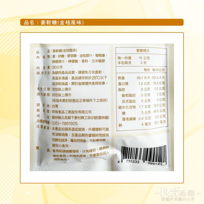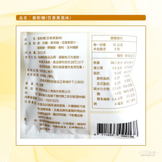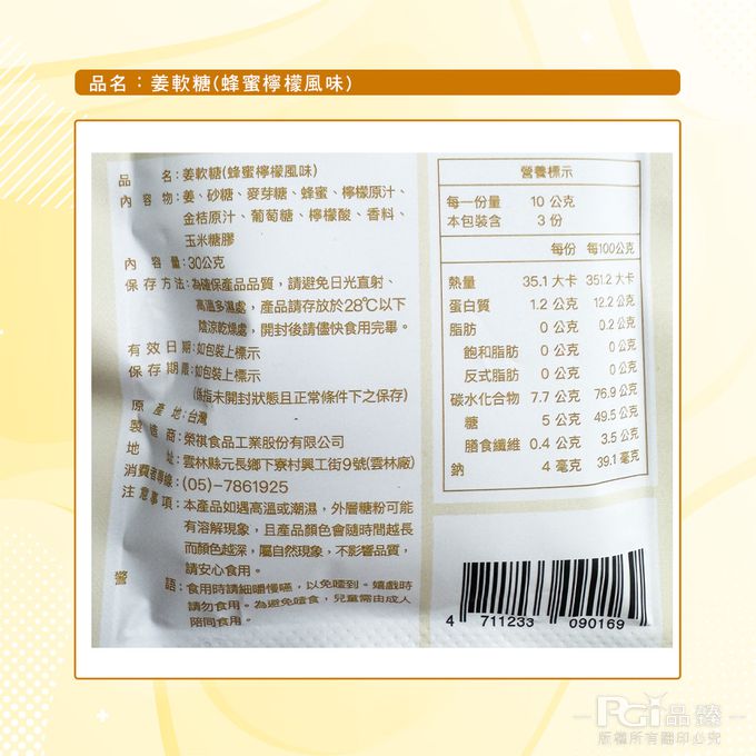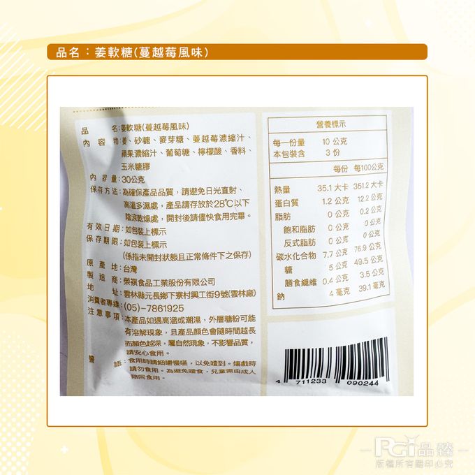 品名:姜軟糖(金桔/百香果/蜂蜜檸檬/紅葡萄/蔓越莓/芒果/鳳梨)(30g)_10包組