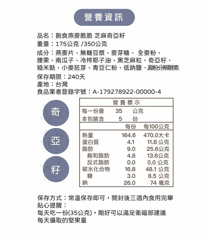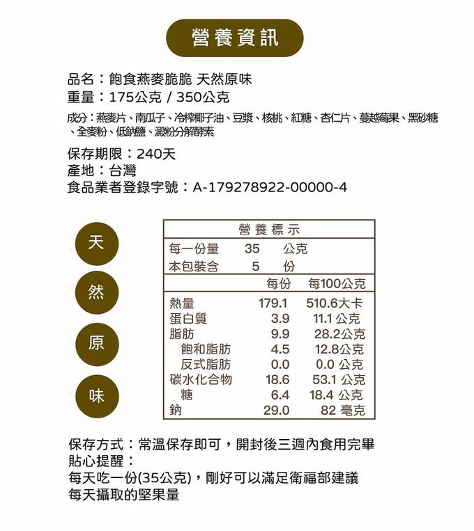 成分:原味:燕麥片、南瓜子、冷榨椰子油、豆漿、核桃、紅糖、杏仁片、蔓越莓果、黑砂糖、全麥粉、低鈉鹽、澱粉分解酵素 芝麻:燕麥片、無糖豆漿、麥芽糖、全麥粉、腰果、南瓜子、冷榨耶子油、黑芝麻粒、奇亞籽、糙米麩、小麥胚芽、青豆仁粉、低鈉鹽、澱粉分解酵素 可可:燕麥片、榛果、豆漿、紅糖、杏仁片、冷榨椰子油、水滴巧克力、全麥粉、核桃、深黑巧克力、可可粉、低鈉鹽、澱粉分解酵素