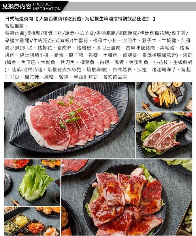 1.單張券可2人平日於《老燒肉》享用人氣百匯燒烤吃到飽+海尼根生啤酒或當日特調飲品任選二。(已含服務費)