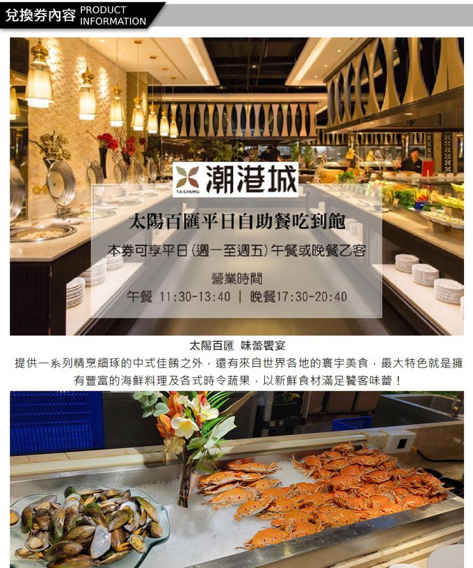 1.單張可1人於《台中潮港城-太陽百匯》享平日午/晚餐吃到飽乙客。(已含服務費)