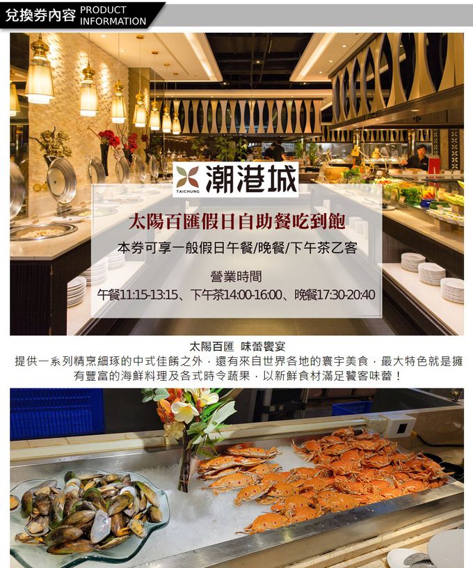 1.單張可1人於《台中潮港城-太陽百匯》享假日午/晚餐/下午茶吃到飽乙客。(已含服務費)