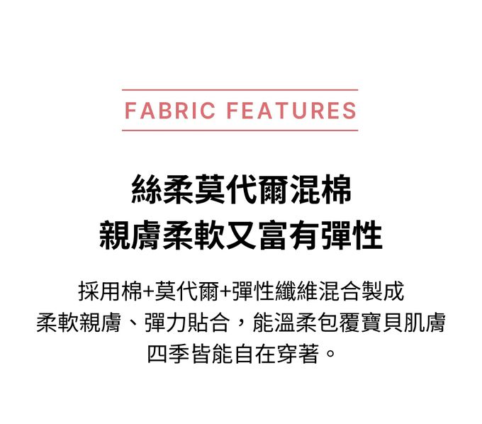 (01.) 柔軟舒適的穿著感受,棉+莫代爾混紡材質,觸感細膩又溫潤,即使是敏感肌的孩子也能安心穿著,毫無刺激。