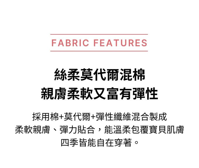 (01.) 柔軟舒適的穿著感受,棉+莫代爾混紡材質,觸感細膩又溫潤,即使是敏感肌的孩子也能安心穿著,毫無刺激。