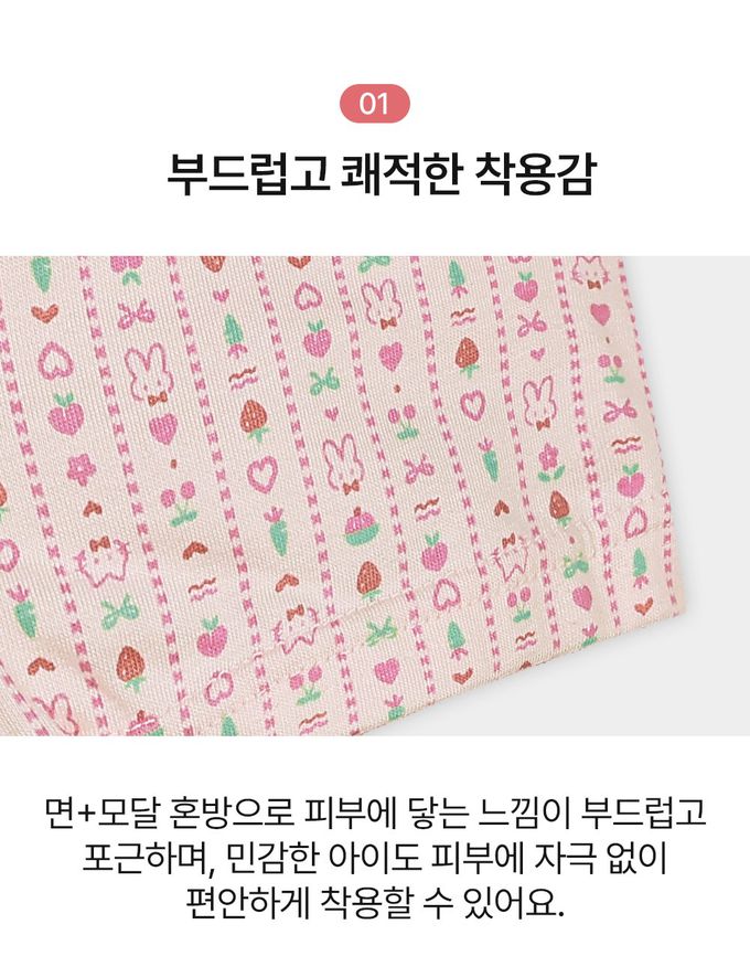 (01.) 柔軟舒適的穿著感受,棉+莫代爾混紡材質,觸感細膩又溫潤,即使是敏感肌的孩子也能安心穿著,毫無刺激。