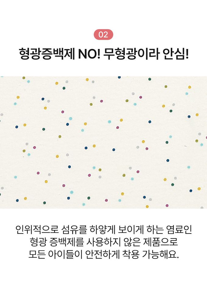 (02.) 不含螢光增白劑(一種使布料更白的化學染料)不易致敏,所有膚質的孩子都能安心好穿
