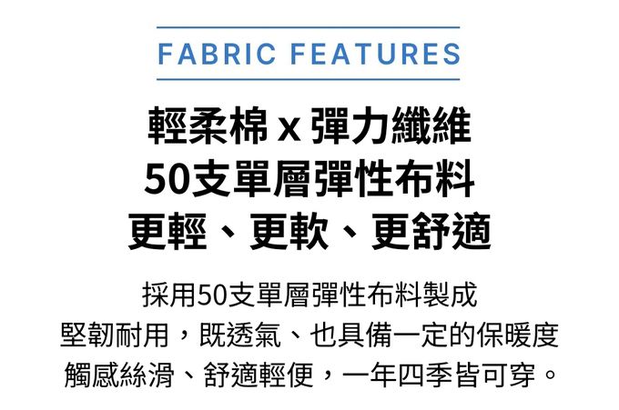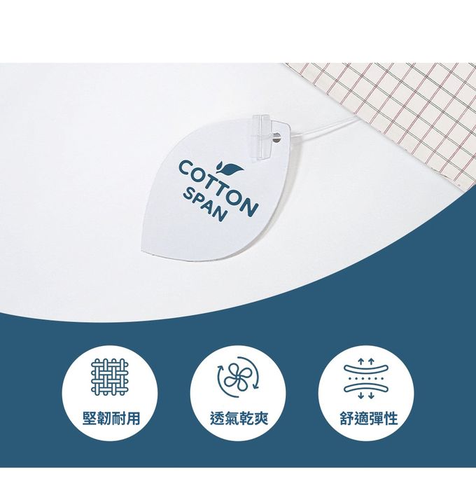 (01.)  採用純棉面料混合彈性纖維,具備良好伸縮性,不緊繃、活動自在,耐用度高,不易變形。