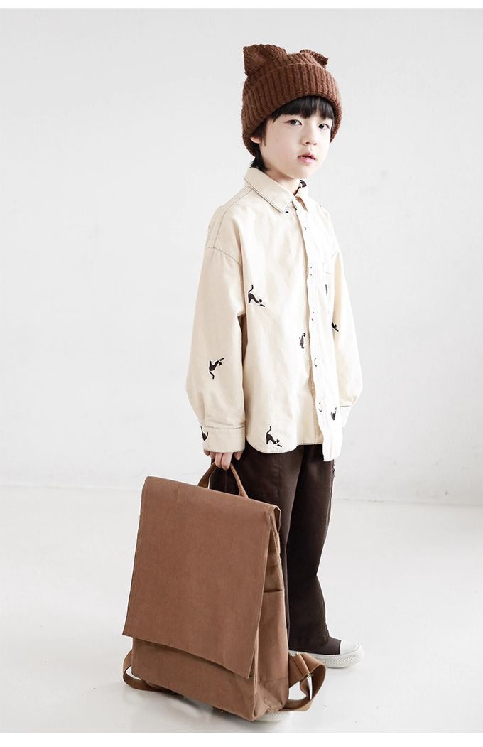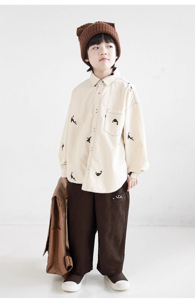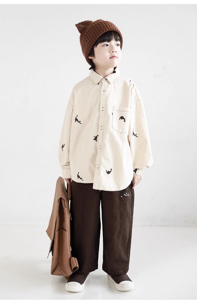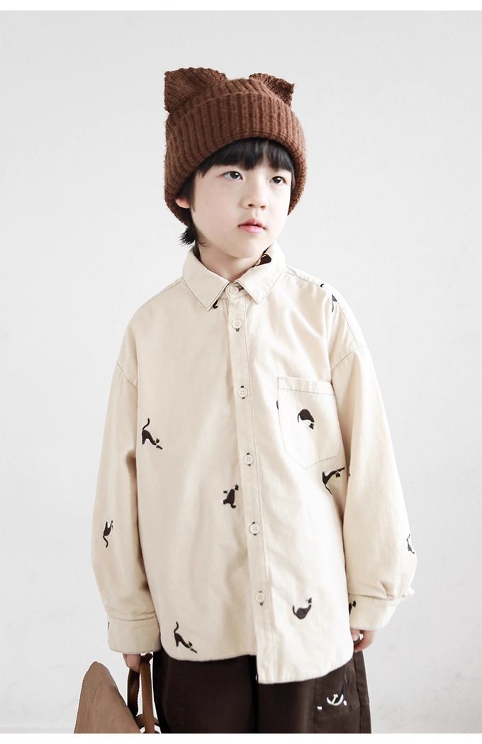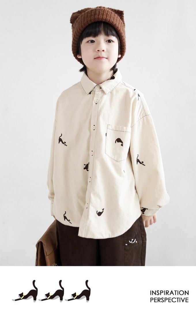 純棉設計感不對稱長袖襯衫-貓咪-米色