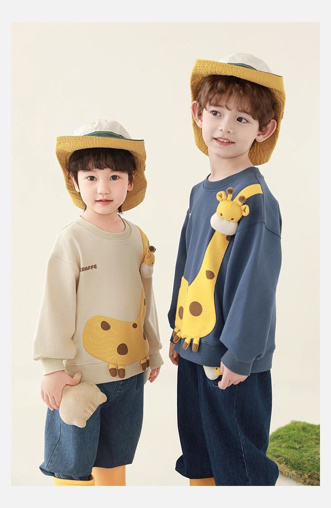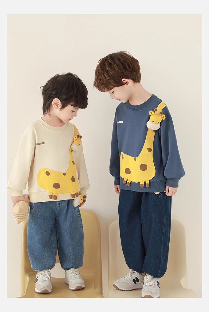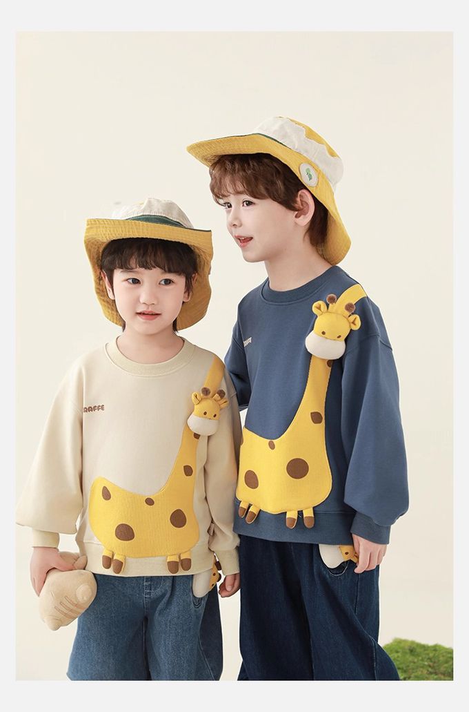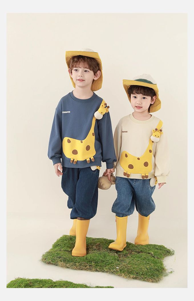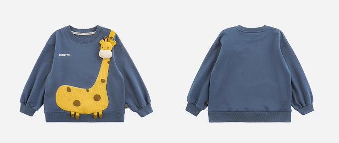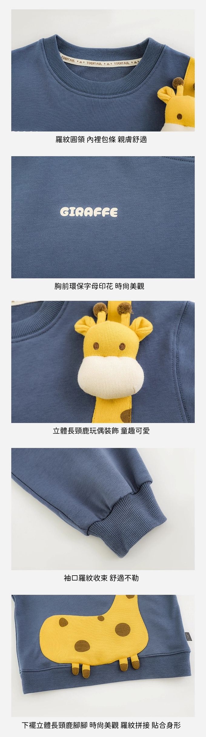 圓領大學T/長袖上衣-立體長頸鹿-藍色