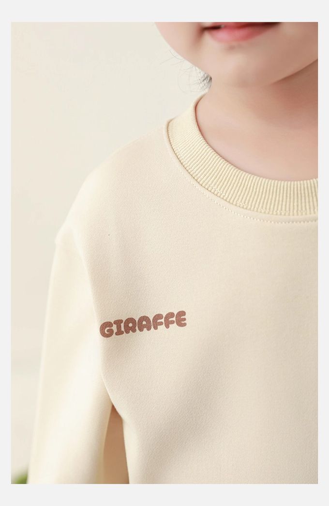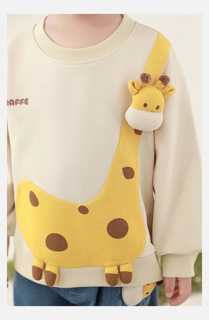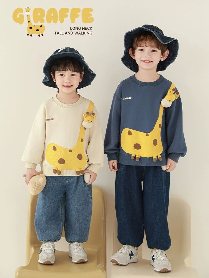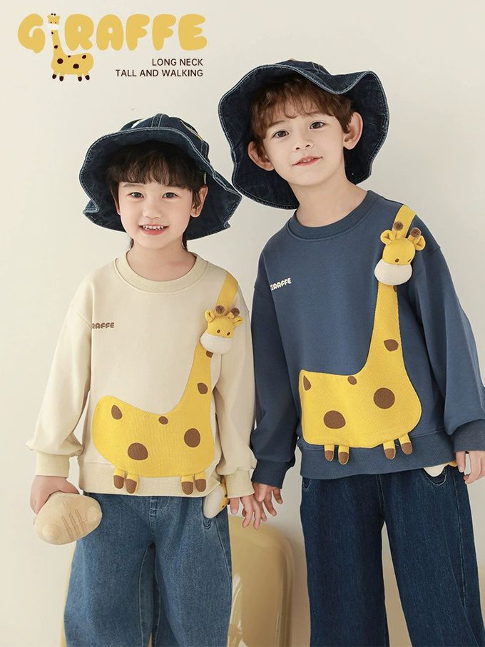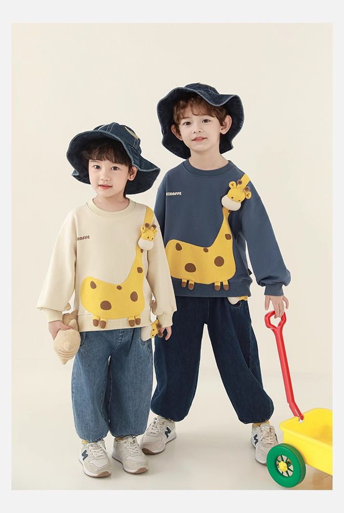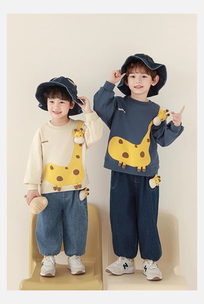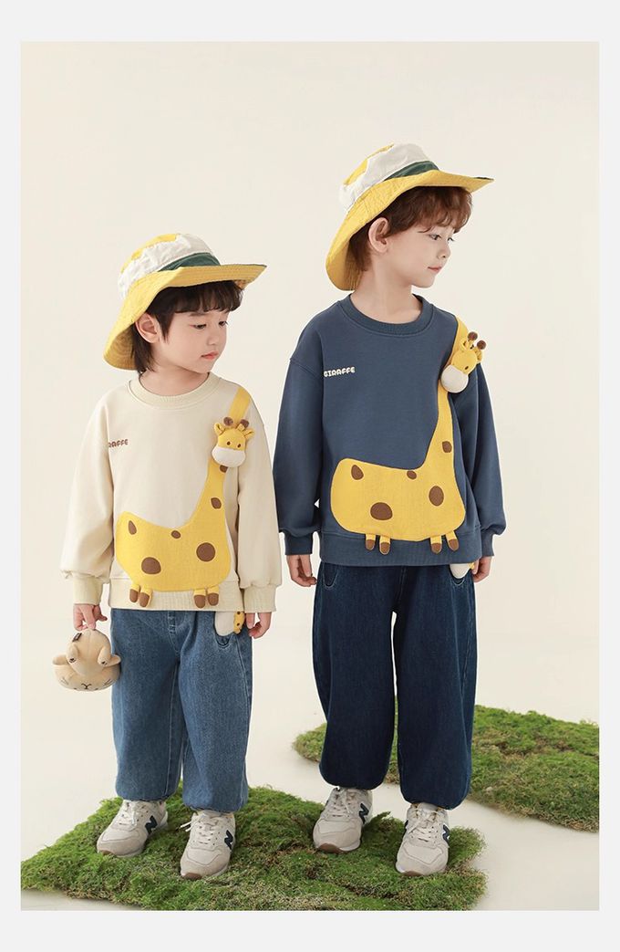 圓領大學T/長袖上衣-立體長頸鹿-藍色