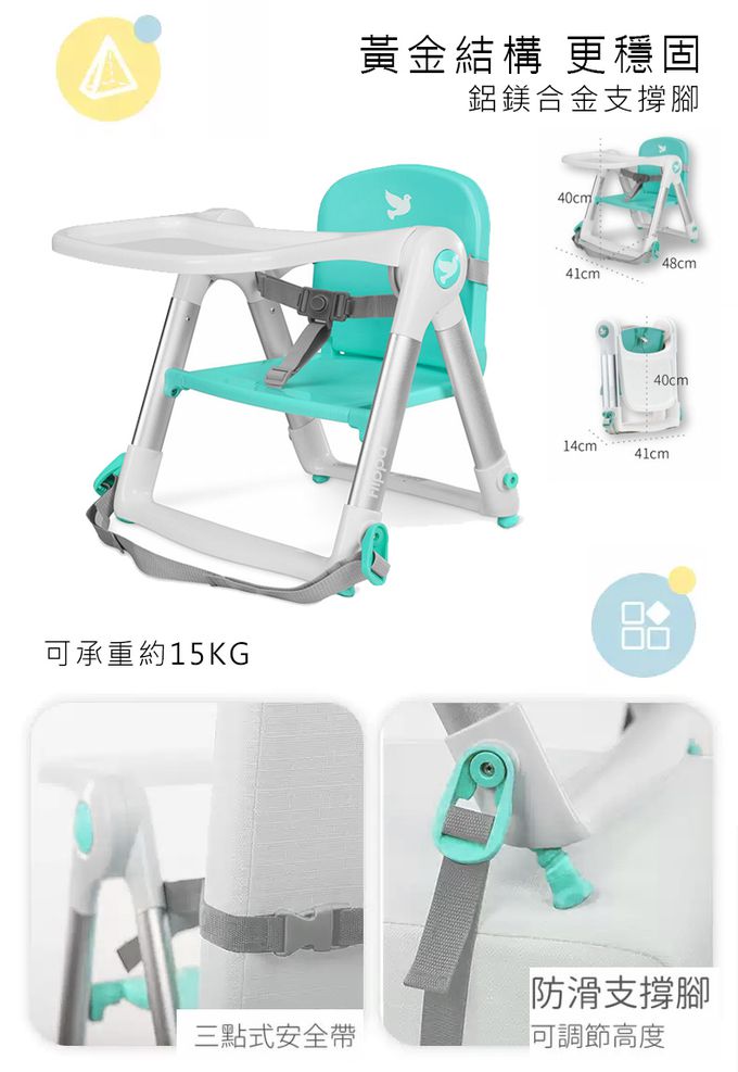 注意事項:適用年齡:6個月-36個月(本產品供能自行坐立之兒童使用,且不超過15公斤) 材質:塑膠、聚丙烯、鋁 淨重:約2公斤 最大體重:15公斤 打開尺寸:寬41公分x高40公分x深48公分 摺疊尺寸:寬41公分x高40公分x深14公分 產地:中國(英國企劃設計) 商品檢驗標識號:R45656 【注意事項】 ● 請勿裝設在椅背或座椅不穩的椅子上,及無法將本商品固定而有掉落危險的椅子上。 ● 坐穩後,請特兒童繫好固定帶,並有大人在旁陪同。 ● 餐椅展開或收納時,請務必裝上餐盤之後才操作,否則不當的操作會使商品損壞。 ● 使用前請詳閱說明書,內含重要訊息,請妥善保管。 ● 切勿留置兒童無人照護。 ● 務必使用束縛系統並確保安全安裝。 ● 使用椅上架高座椅之前,必檢查安全性及穩定性。