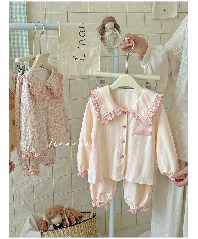 LINANXI - 純棉森林系娃娃領長袖家居服套裝-粉杏條紋