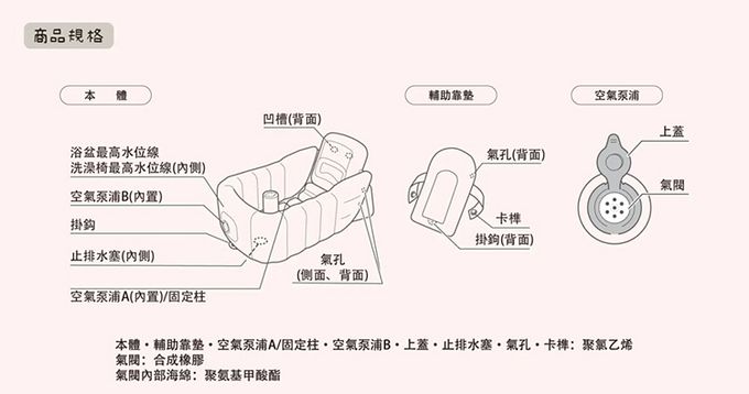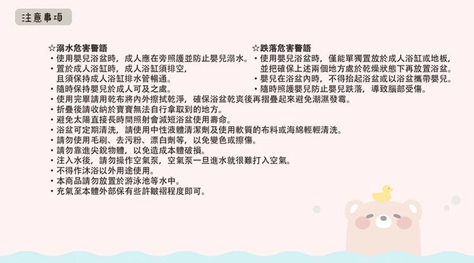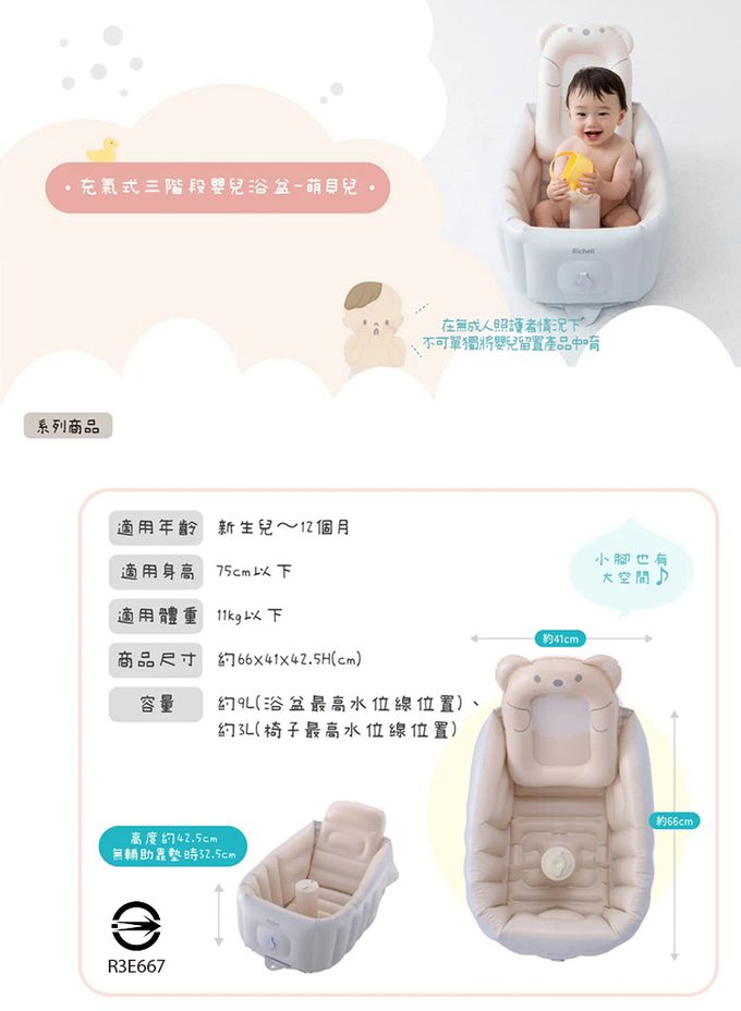 注意事項:年齡:新生兒 ~ 12個月 材質:聚氯乙烯、合成橡膠、聚氨基甲酸酯 尺寸:約 66x41x42.5cm 容量:約 9L(浴盆最高水位線位置);約 3L(椅子最高水位線位置) 承重:11kg以下,75cm以下 產地:中國 商品檢驗標識號:R3E667年齡:新生兒 ~ 12個月 材質:聚氯乙烯、合成橡膠、聚氨基甲酸酯 尺寸:約 66x41x42.5cm 容量:約 9L(浴盆最高水位線位置);約 3L(椅子最高水位線位置) 承重:11kg以下,75cm以下 產地:中國 商品檢驗標識號:R3E667 【注意事項】 ● 使用嬰兒浴盆時,成人應在旁照護並防止嬰兒溺水。 ● 置於成人浴缸時,成人浴缸須排空,且須保持成人浴缸排水管暢通。 ● 隨時保持嬰兒於成人可及之處。 ● 使用完畢請用乾布將內外擦拭乾淨,確保浴盆乾爽後再摺疊起來避免潮濕發霉。 ● 摺疊後請收納於寶寶無法自行拿取到的地方。 ● 避免太陽直接長時間照射會�短浴盆使用壽命。 ● 浴盆可定期清洗,請使用中性液體清潔劑及使用軟質的布料或海綿輕輕清洗。 ● 請勿使用毛刷、去污粉、漂白劑等,以免變色或擦傷。 ● 請勿靠近尖銳物體,以免造成本體破損。 ● 注入水後,請勿操作空氣泵,空氣泵一旦進水就很難打入空氯。 ● 不得作沐浴以外用途使用。 ● 本商品請勿放置於游泳池等水中。 ● 充氣至本體外部保有些許皺褶程度即可。 ● 使用嬰兒浴盆時,僅能單獨置放於成人浴缸或地板,並把確保上述雨兩個地方處於乾燥狀態下再放置浴盆。 ● 嬰兒在浴盆內時,不得抬起浴盆或以浴盆攜帶嬰兒。 ● 隨時照護嬰兒防止嬰兒跌落,導致腦部受傷。