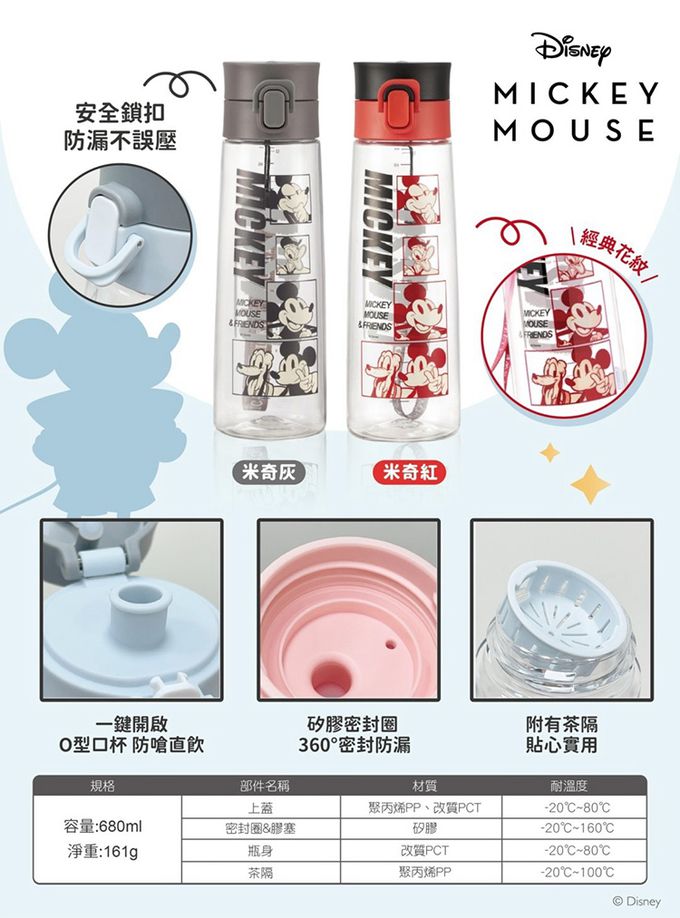 材質:《直飲蓋》 材質:聚丙烯PP、改質PCT;耐溫:-20°C~80°C 《密封圈&膠塞》 材質:矽膠;耐溫:-20°C~160°C 《瓶身》 材質:改質PCT;耐溫:-20°C~80°C 《茶隔》 材質:聚丙烯PP;耐溫:-20°C~100°C