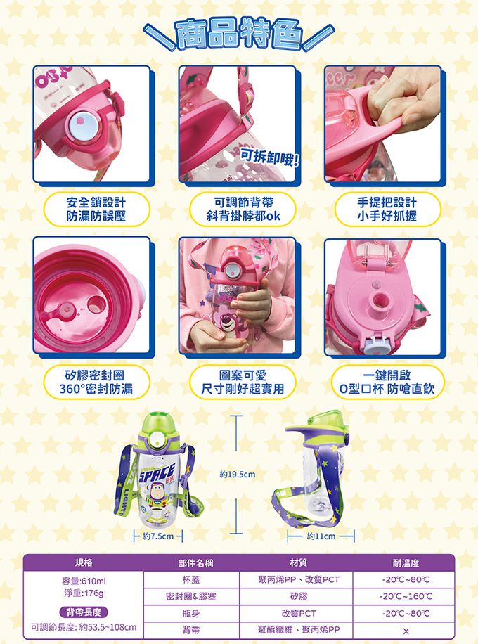 注意事項:《杯蓋》 材質:聚丙烯PP、改質PCT 耐溫:-20°C~80°C 《密封圈&膠塞》 材質:矽膠 耐溫:-20°C~160°C 《瓶身》 材質:改質PCT 耐溫:-20°C~80°C 《背帶》 材質:聚酯纖維、聚丙烯PP 產地:中國 食品業者登錄字號:H-124855364-00000-2 【注意事項】 ● 供重複性使用。 ● 本商品不適合臥躺飲用。 ● 使用本產品前請以中性清潔劑清洗。 ● 請勿盛裝溫度過高的液體,以免燙傷。 ● 請在家長指導下使用,避免燙傷及危險。 ● 水瓶零件請勿讓幼童玩耍以免誤食發生危險。 ● 請依使用者的飲水能力判斷是否適用直飲式水瓶。 ● 請勿放入洗碗機、烘乾機、微波爐、消毒鍋等設備。 ● 使用前務必詳閱說明書,內含重要訊息請妥善保管。 ● 使用前請先檢查商品是否有破損,如有破損請立即停止使用及更換。