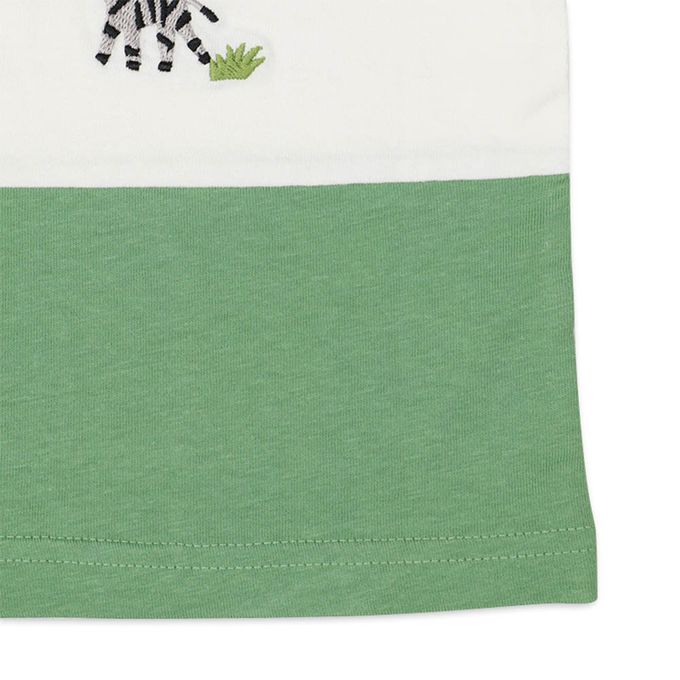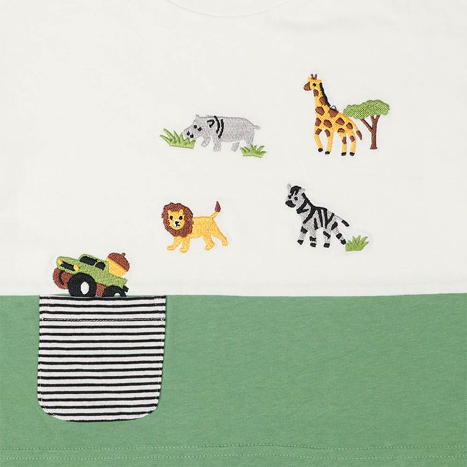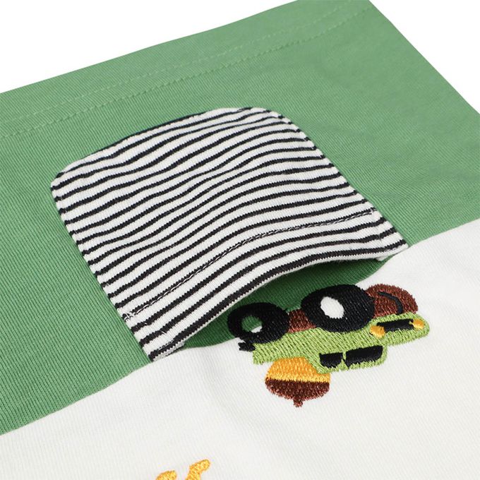 拼接處的條紋口袋有交通工具刺繡探出的設計