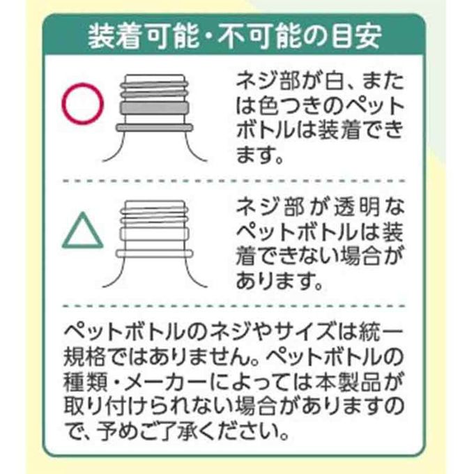 • 注意事項:●寶特瓶專用●使用前請詳閱本說明書,並依照說明內容正確地使用。【清潔注意事項】●可使用微波爐・消毒液・煮沸消毒。●可用洗碗機或烘碗機清洗。●煮沸消毒時,請在較大的鍋子中加入足量的熱水,避免產品接觸鍋子內側,煮沸2~3分鐘。●使用微波爐消毒或藥劑消毒時,請依各消毒用品的使用說明操作。●使用洗碗機或烘碗機時,請依各設備的使用說明操作。●漂白時請使用廚房用氧系漂白劑,並依照其使用方法操作。●耐冷溫度:‐40℃
