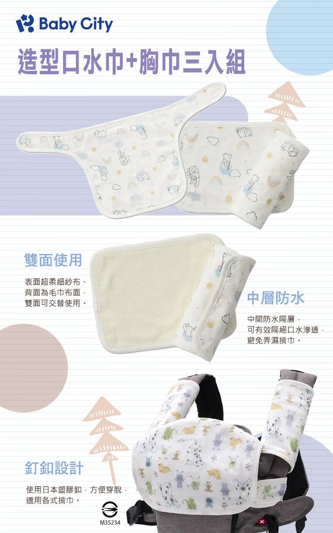 注意事項:年齡:0歲以上 材質:表-43%嫘縈、57%棉;中-100%聚酯纖維;底-48%棉、32%嫘縈、20%聚酯纖維 尺寸:口水巾-21x17cm;胸巾-58x25cm 產地:台灣 商品檢驗標識號:M35234 【注意事項】 ● 如有破損請勿繼續使用。 ● 選購時,請先確認產品尺寸是否適合。 ● 請在成人看護下使用,避免意外發生。 ● 請勿置於潮溼、高溫環境並遠離火源。 ● 使用完畢務必清潔乾淨並保持乾燥避免孳生黴菌。 ● 避免嬰幼兒產生窒息危險,請拆卸後立即將此包裝塑膠袋銷毀或遠離嬰幼兒。 《洗滌方式》 ● 勿大力扭乾並懸掛晾乾。 ● 最高溫度攝氏110度熨燙及壓燙。 ● 不可專業乾洗、不可漂白、不可翻滾烘乾。 ● 使用中性洗劑、水溫攝氏30度以下,以手洗滌,深淺衣物分開 。