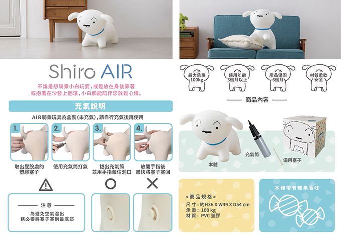注意事項:尺寸:充氣後約36×35×60cm / 外盒尺寸30×30×30 cm 重量:3kg 耐重:100kg 材質:PVC塑膠 製造地:中國大陸 適用對象:3歲以上 商品檢驗字號:(U)C20743665 【注意事項】 ● 不得接觸火源。 ● 請在成人監護下使用。 ● 3歲以下嬰幼童請勿使用。 ● 勿放入口中以防吞食窒息。 ● 包裝應於拆卸後立即丢棄,以避免嬰幼兒窒息。