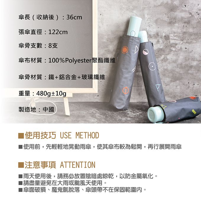 注意事項:1.雨天使用後,請務必放置於陰暗處晾乾,以防金屬氧化。 2.本產品不建議在颱風天使用。