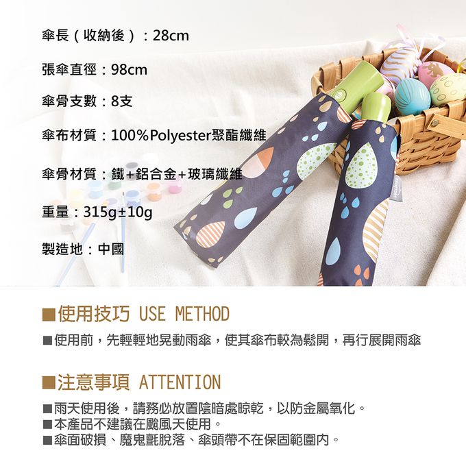 注意事項:1.雨天使用後,請務必放置於陰暗處晾乾,以防金屬氧化。 2.本產品不建議在颱風天使用。
