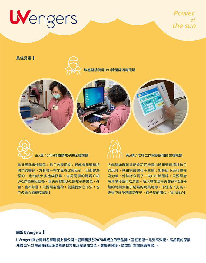 注意事項:重量:138g UV-C LED數量:2 UV-C LED波長:265nm UV-C LED輸出功率:60mW LED數量(輔助光):紅光x1,藍光x1 尺寸:224x32x32.5mm 充電電源:5V 2A 電池類型:Panasonic 18650 Li-ion 電池容量:3300mAh 使用時間:飽電下累計可使用90分鐘 工作/儲存溫度:10°C~45°C 產地:台灣 【注意事項】 ● 不可照射皮膚、眼睛。 ● 請放置在孩童無法觸及的收納處。 ● 應在無人/動物/植物的情況下使用。 ● 勿作為捕蚊燈或一般照明使用。 ● 使用前應詳細閱讀產品說明書,並依說明書要求使用產品。 ● 對於固定式或移動式紫外線消毒(殺菌)燈,開機後迅速離開消毒區域,避免受到紫外線輻射。 ● 對於掌上型紫外線消毒(殺菌)燈設備,產品使用過程中不可對人照射,肉眼不可直視光源。 ● 如產品配備有紫外線防護眼鏡,使用前應檢查眼鏡是否完好並正確配戴。 ● 避免兒童或無法理解正確用法的對象使用。