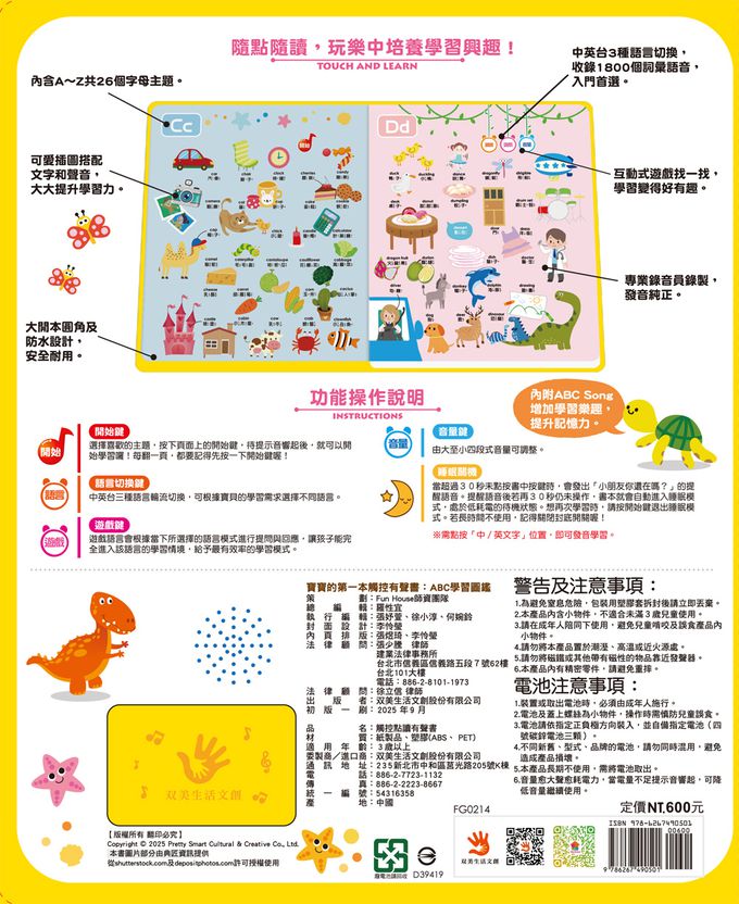 一鍵切換三種語言(中文、英文、台語)模式,專業外語錄音員錄製,發音純正,從小培養多語敏感度,提升三語聽力與口說,在玩樂中輕鬆學習。