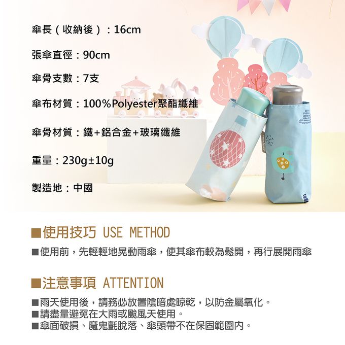 注意事項:1.雨天使用後,請務必放置於陰暗處晾乾,以防金屬氧化。 2.本產品不建議在颱風天使用。