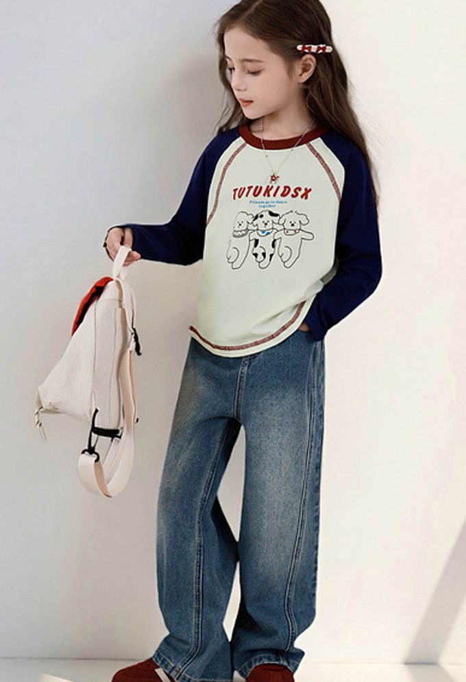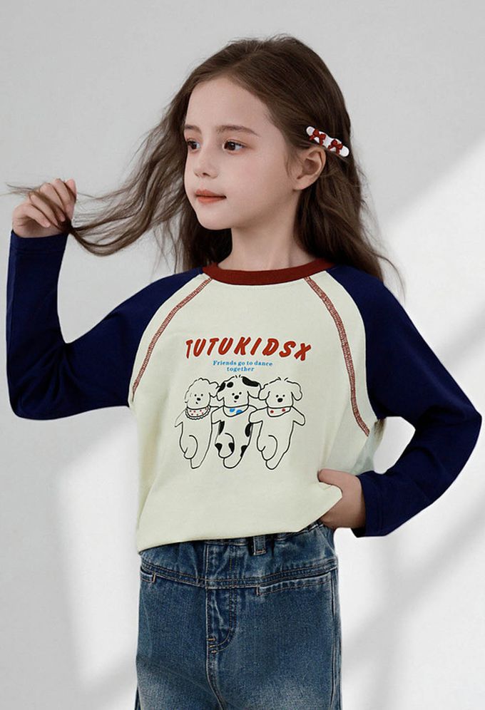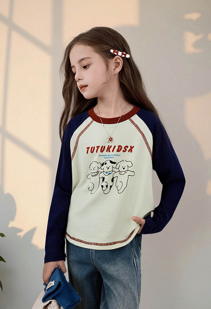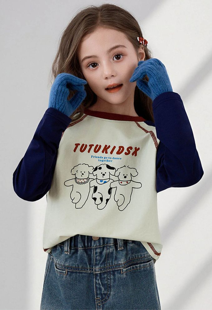 TUTU - 撞色圓領落肩長袖上衣-領巾小狗-藏青拼袖