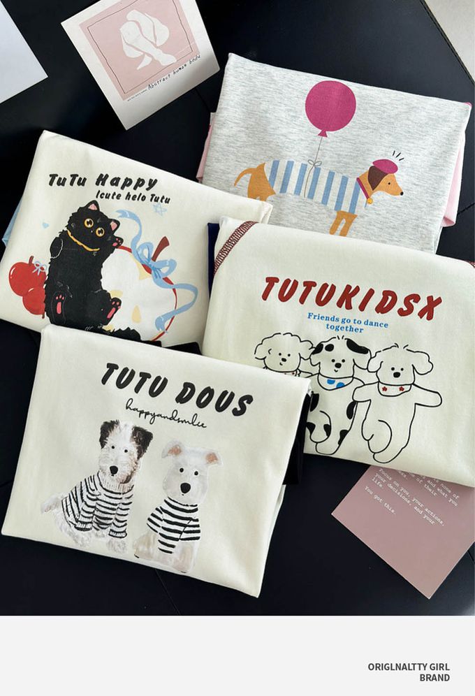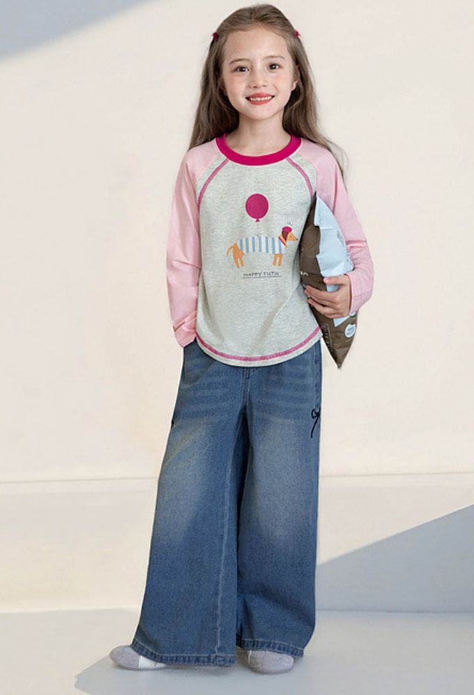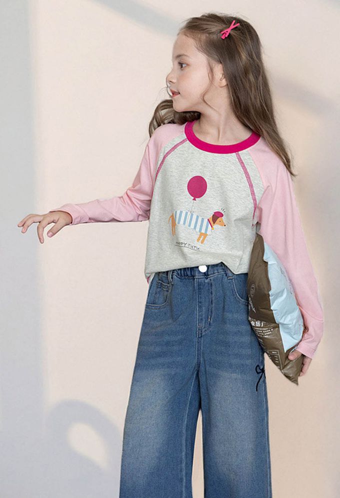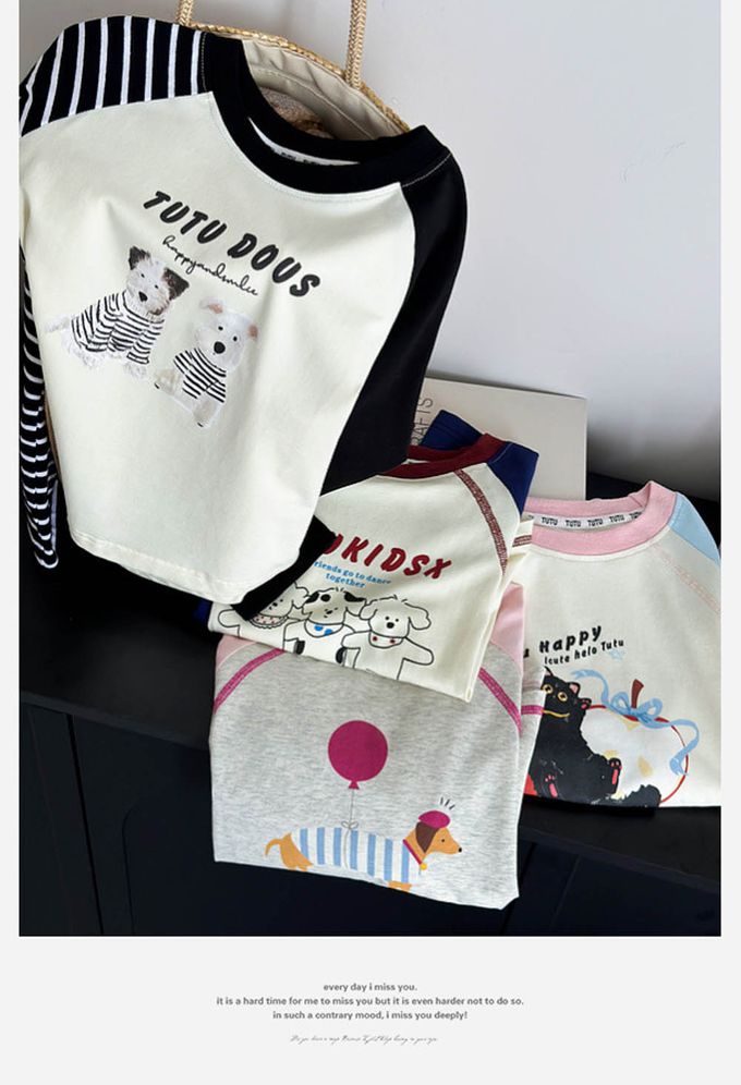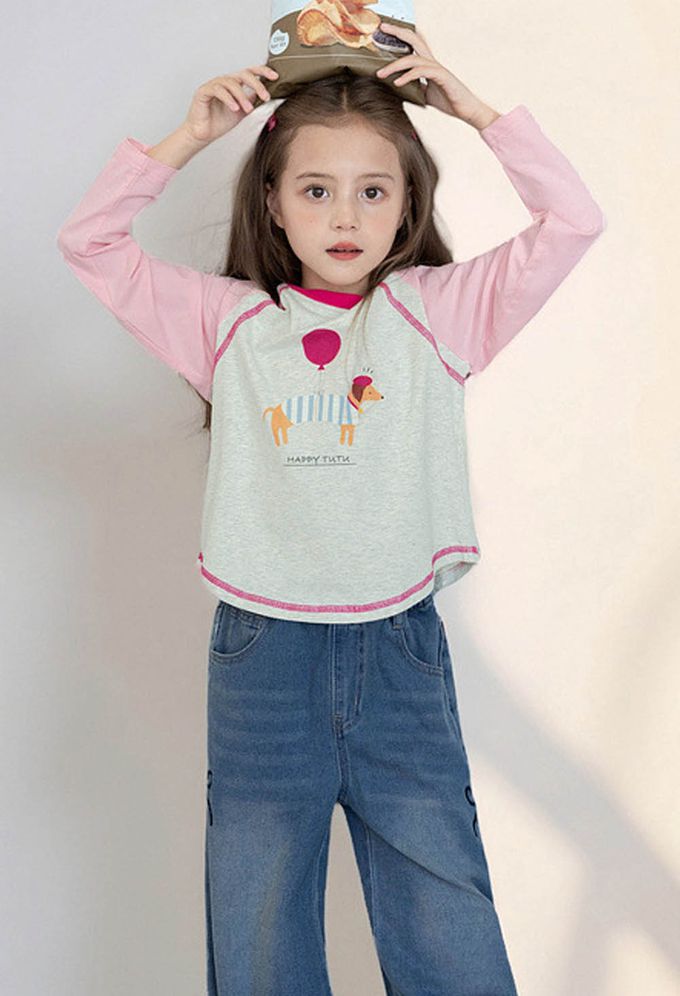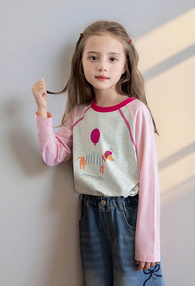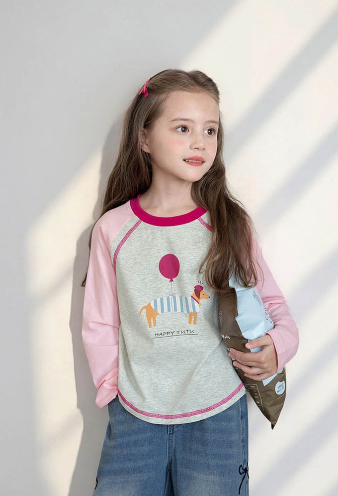 TUTU - 撞色圓領落肩長袖上衣-氣球臘腸狗-粉色拼袖