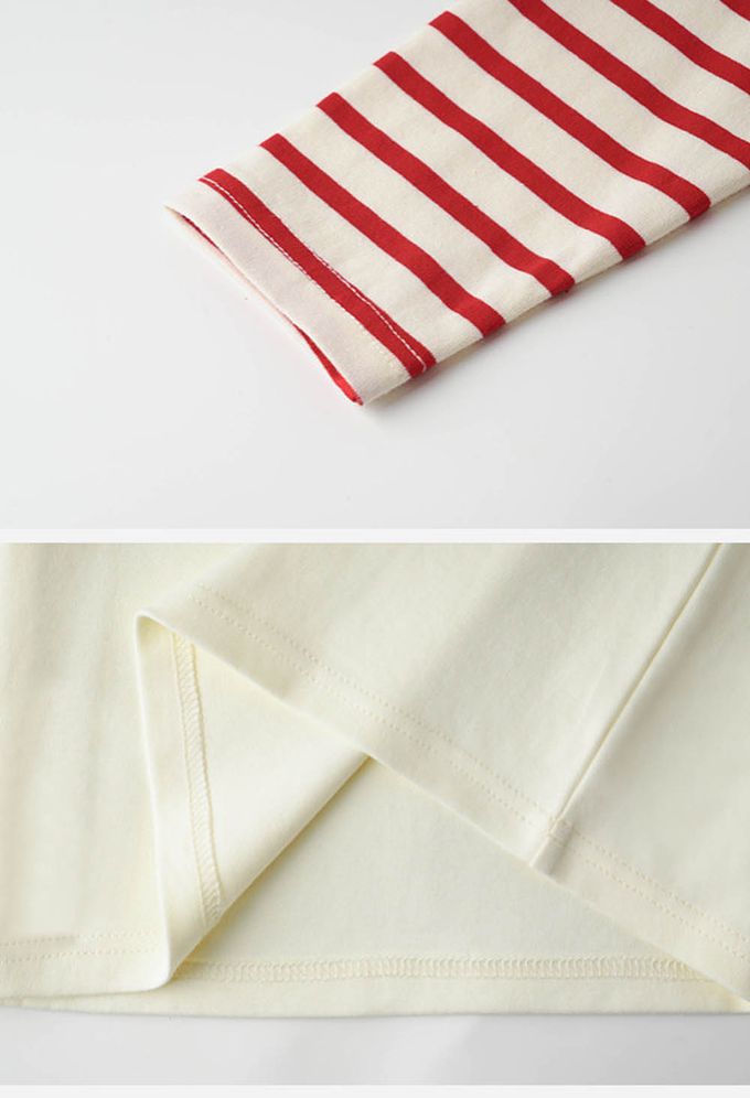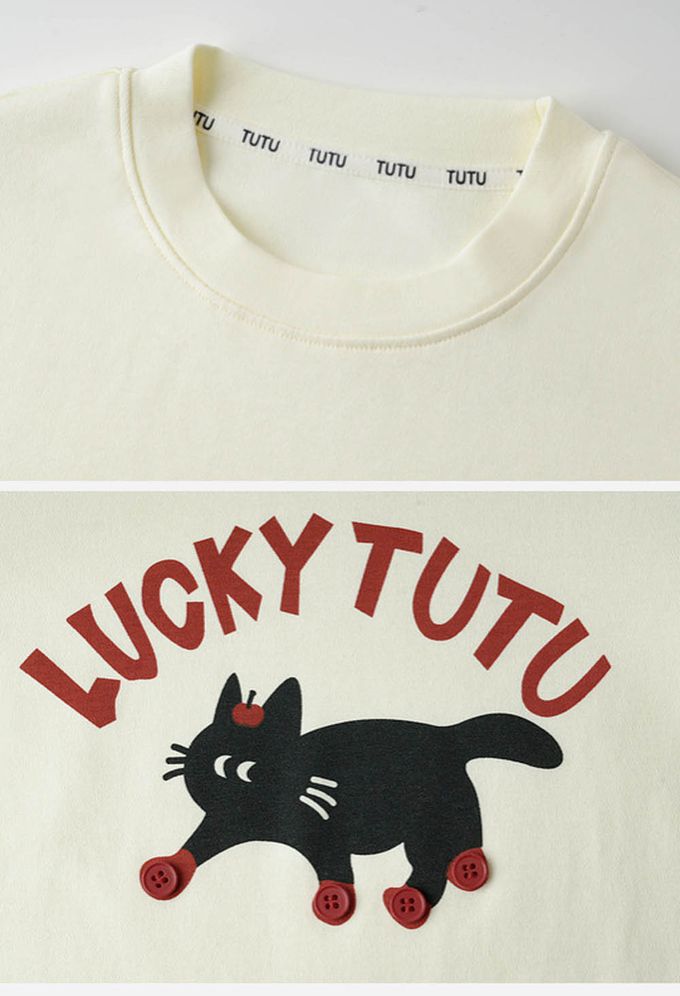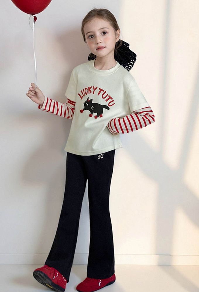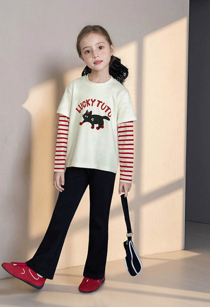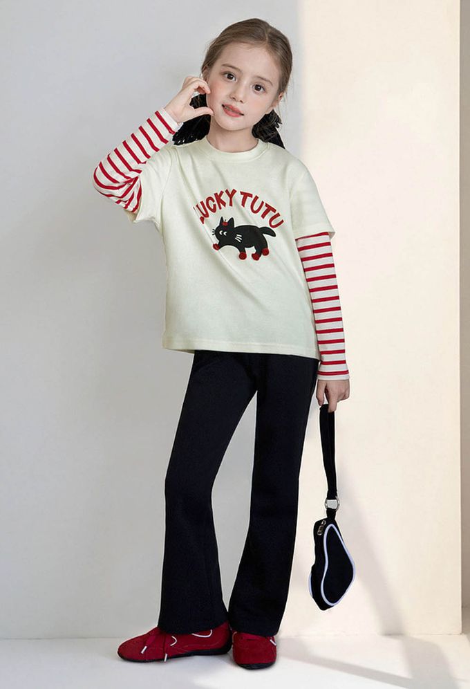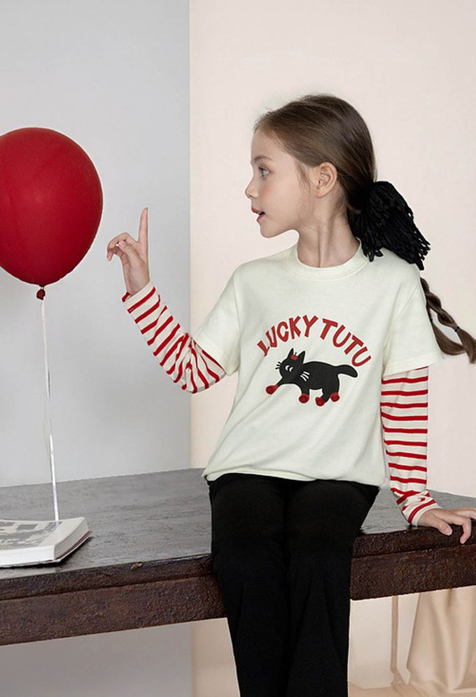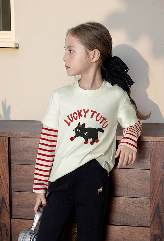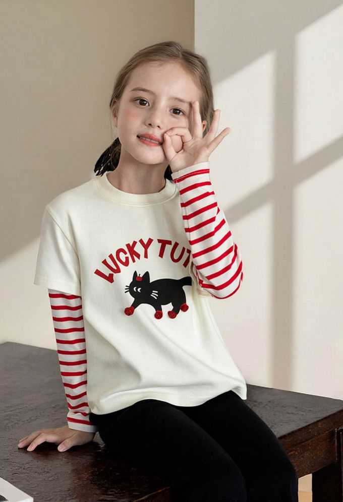 層次感假兩件長袖上衣-可愛貓貓-米杏色