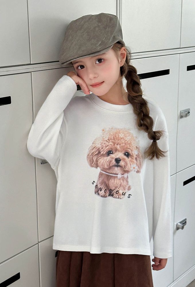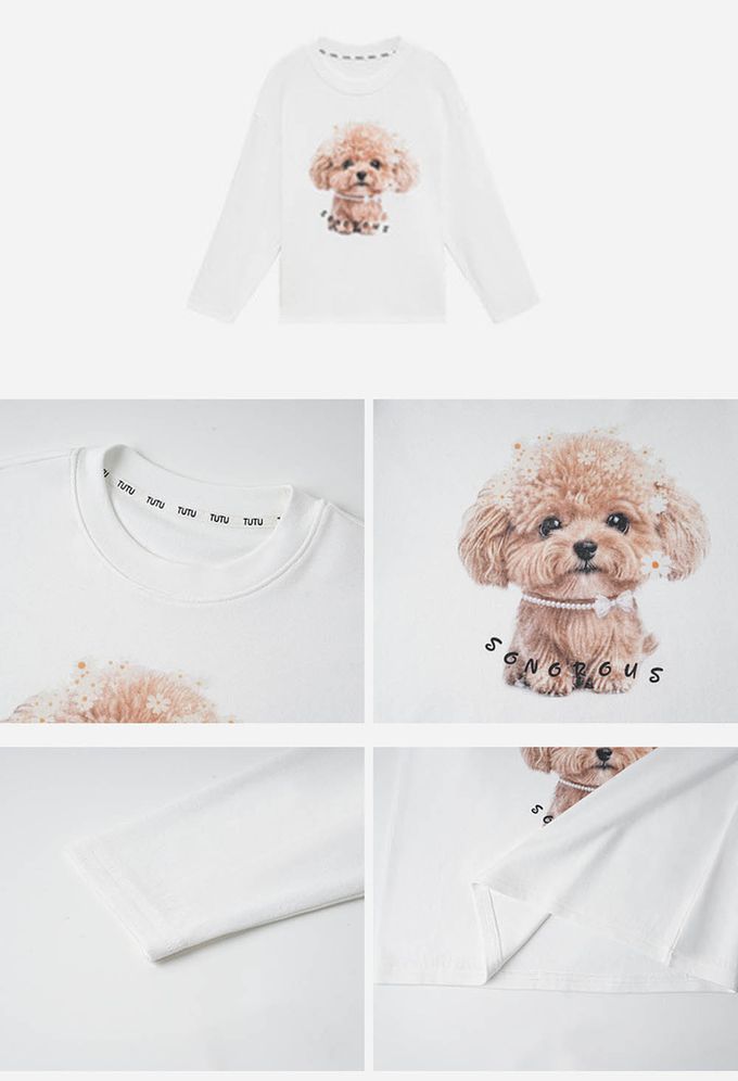 柔軟厚磅圓領長袖上衣-生動小狗-白色