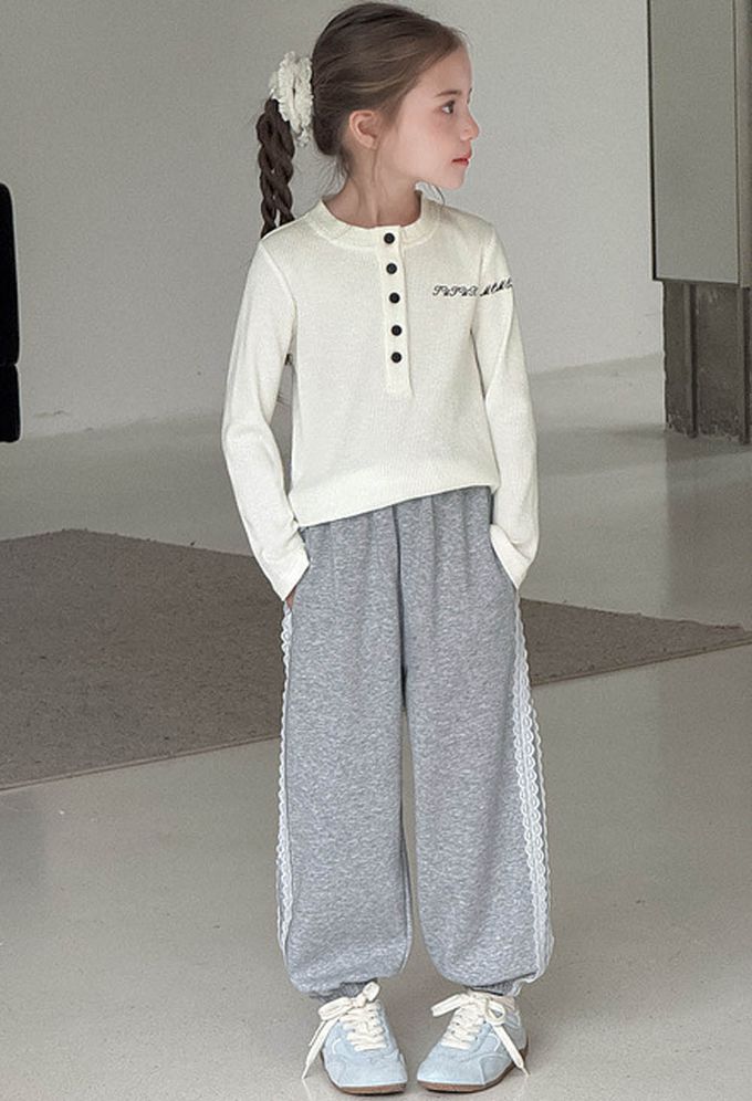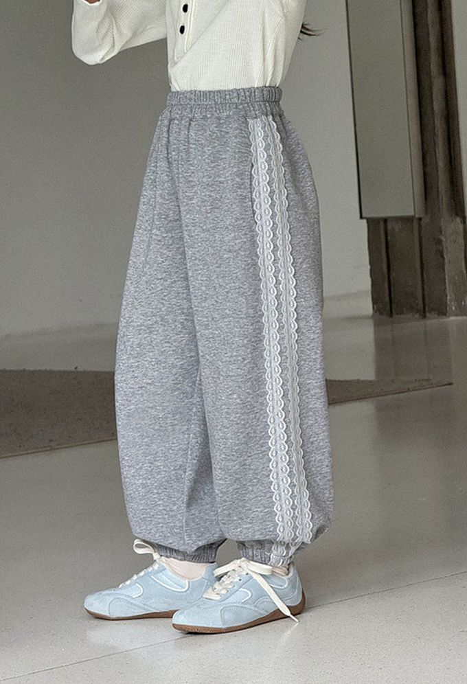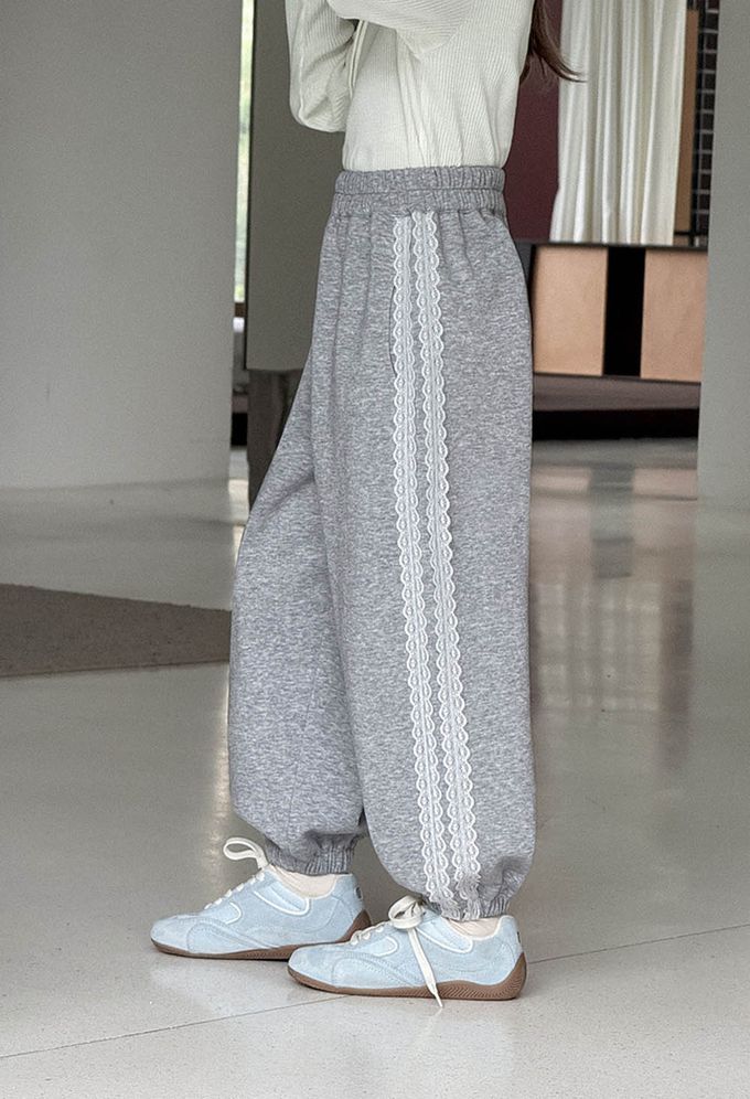 甜酷撞色蕾絲花邊休閒長褲-灰色