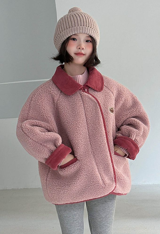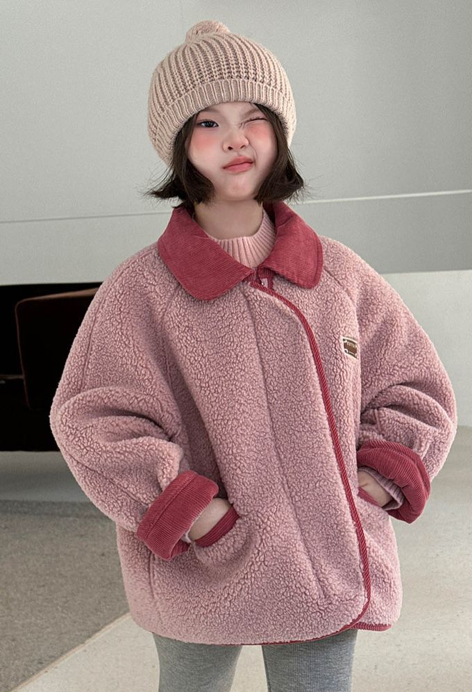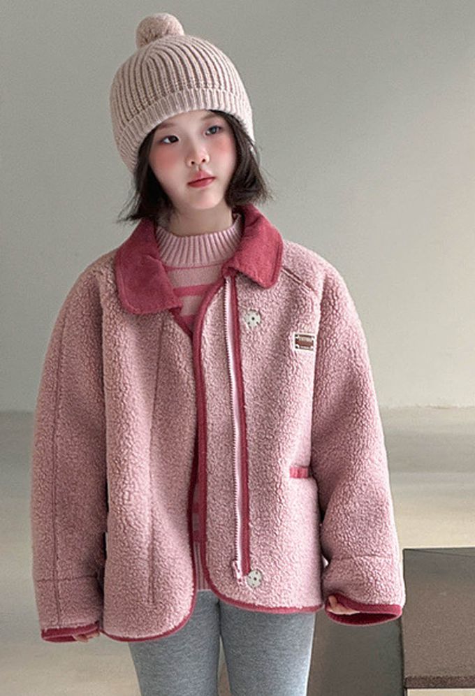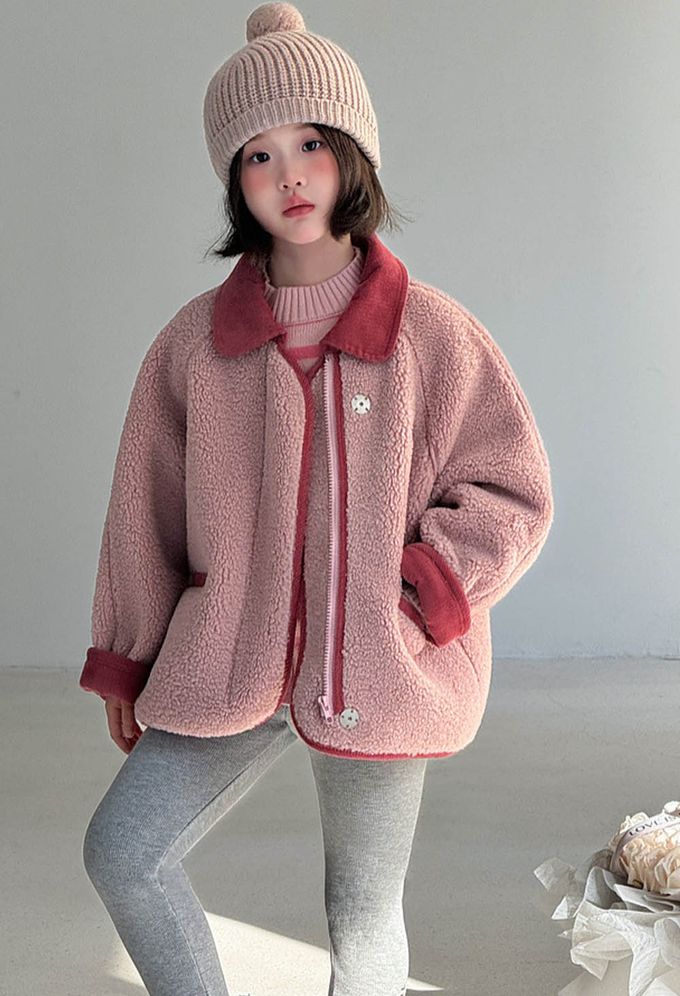羊羔絨感拼色翻領外套-粉色