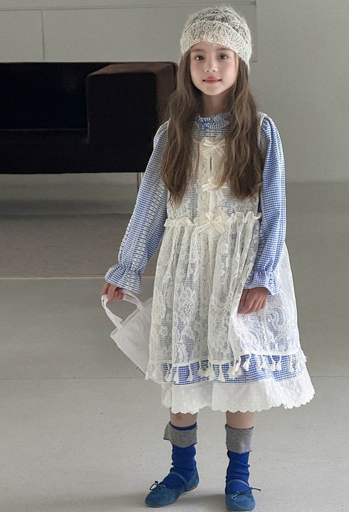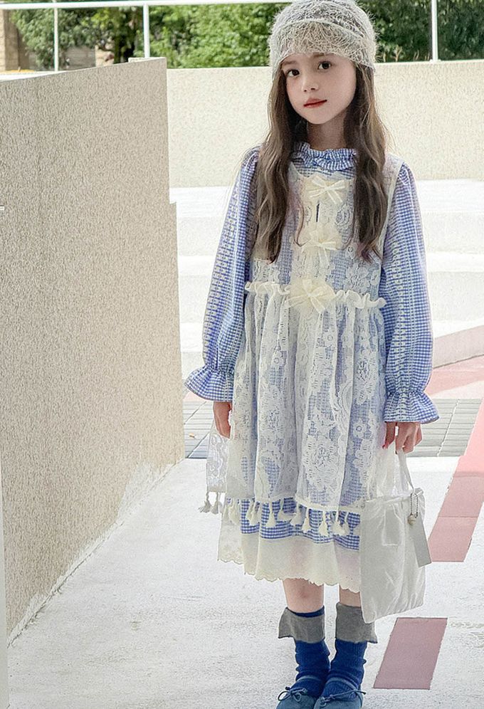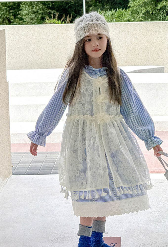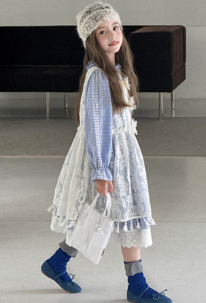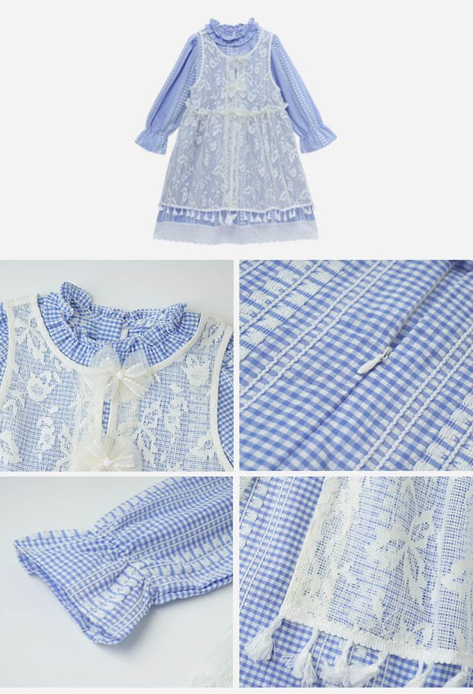 蕾絲罩衫+長袖洋裝兩件式套裝-藍色