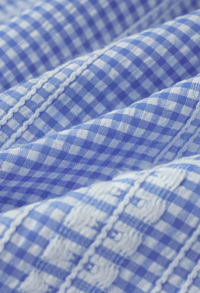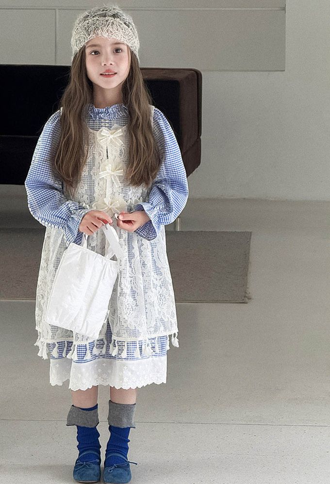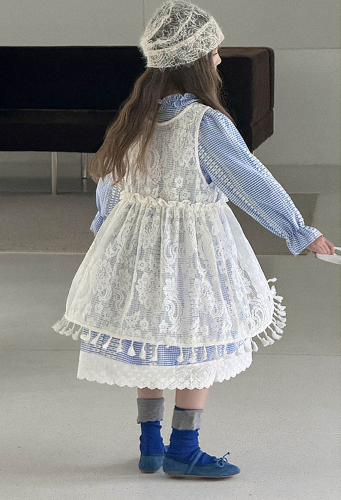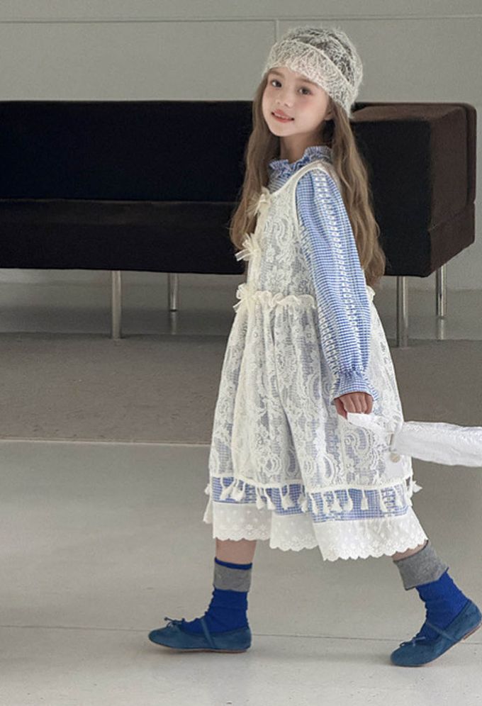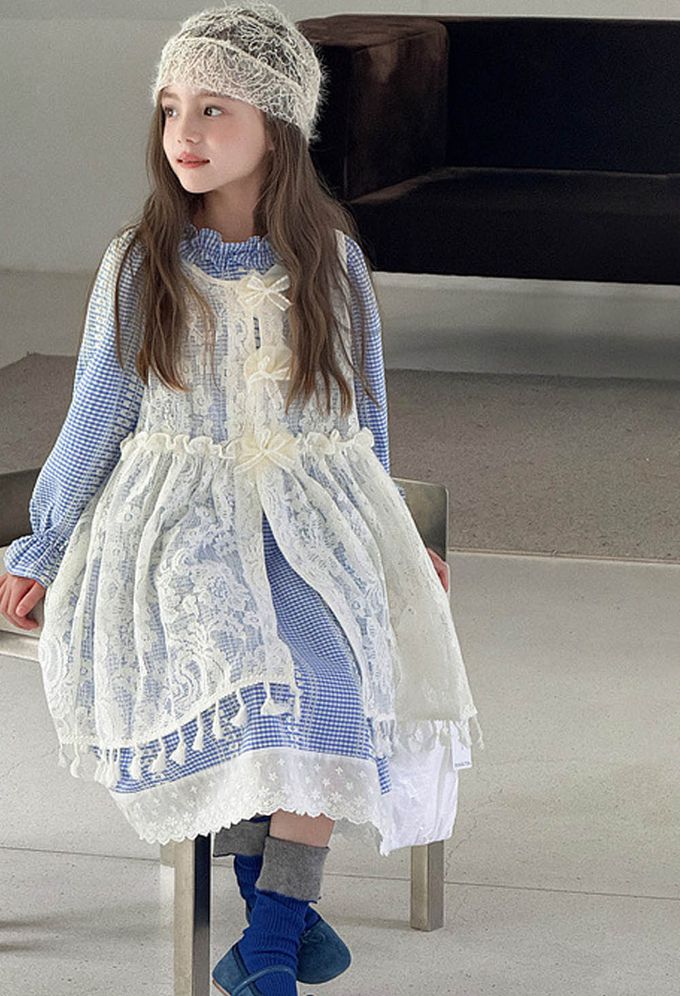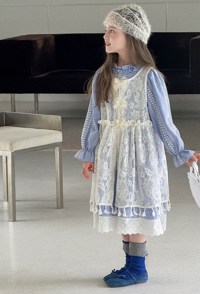 蕾絲罩衫+長袖洋裝兩件式套裝-藍色