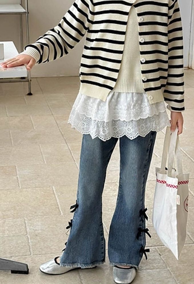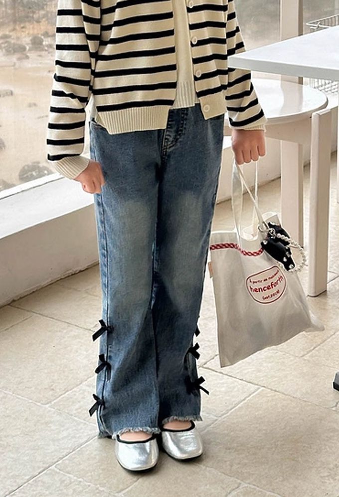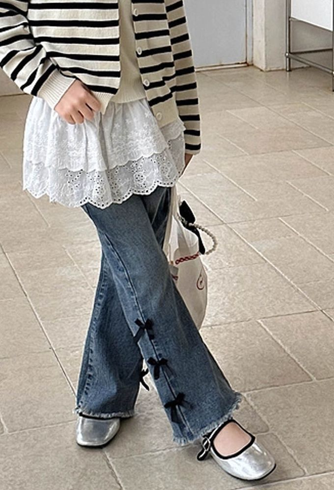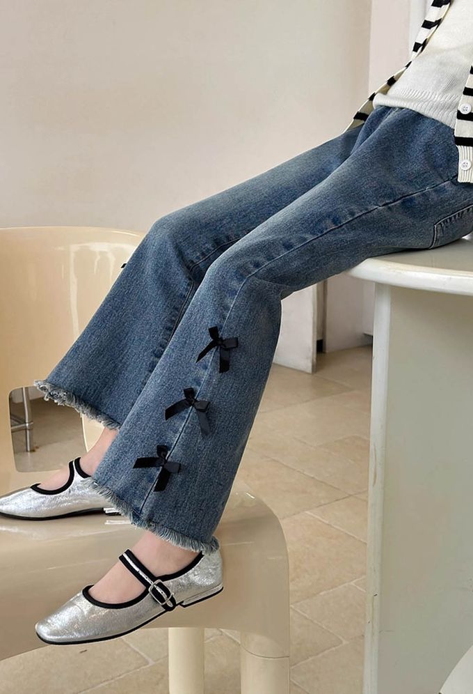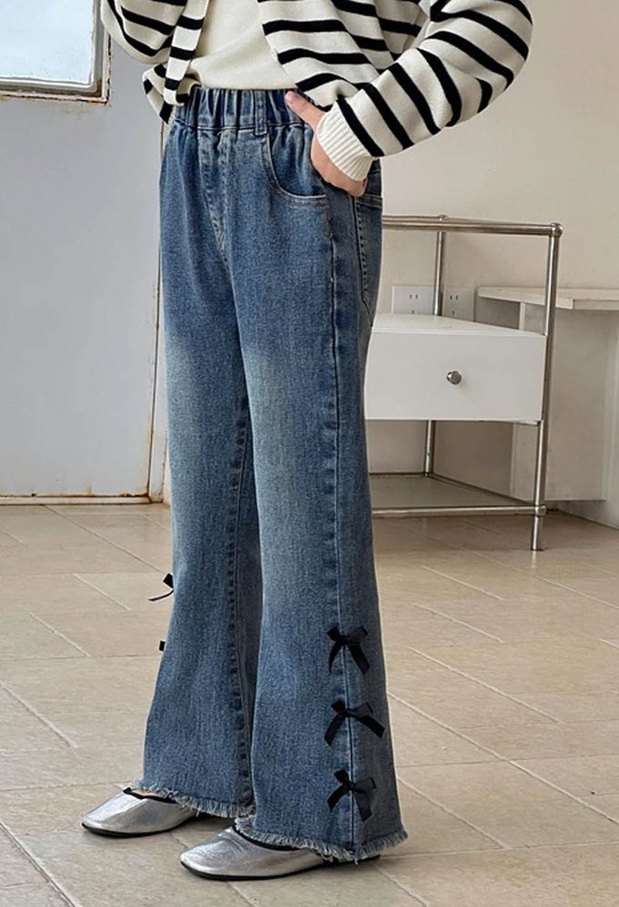 百搭鬚邊微喇叭牛仔褲-蝴蝶結-藍色