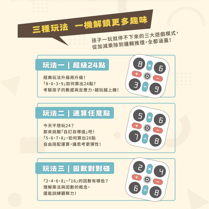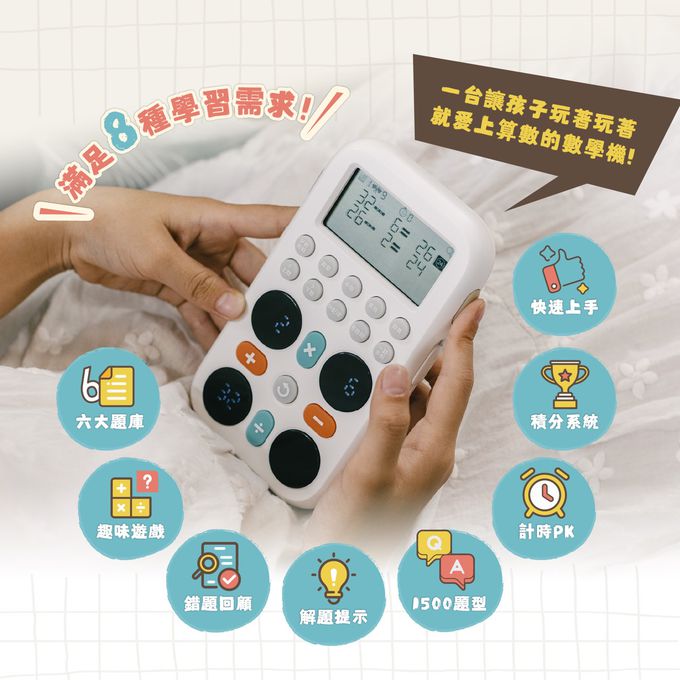 且輕巧一台好攜帶~不分地點,哪裡都是數學練功場!車程變得不無聊、吃飯前等上菜也能來小試身手。隨時隨地動動腦,在日常中建立邏輯力與計算力!