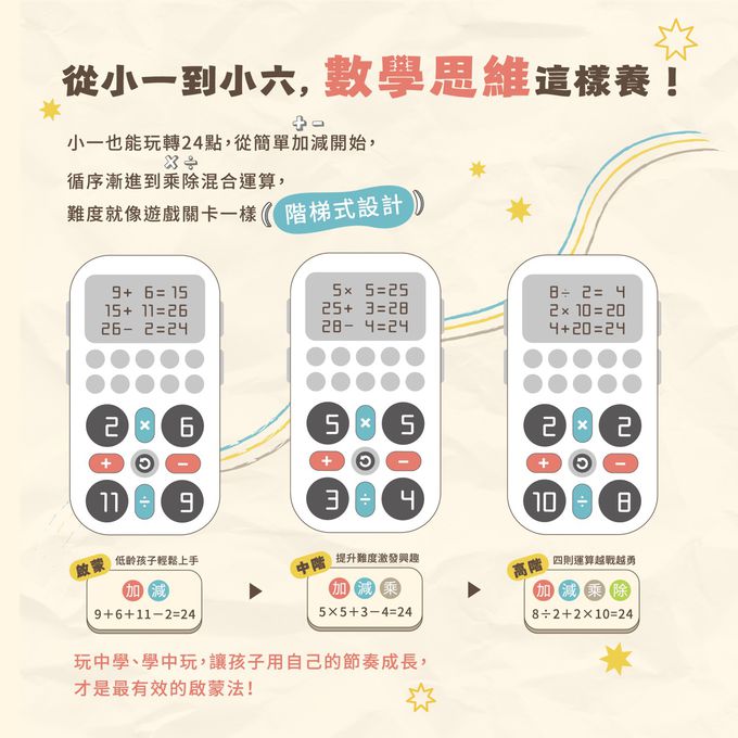 小一也能玩轉24點,從簡單加減開始,循序漸進到乘除混合運算,難度就像遊戲關卡一樣(階梯式設計)