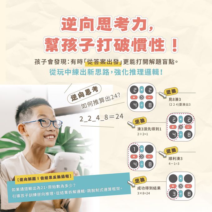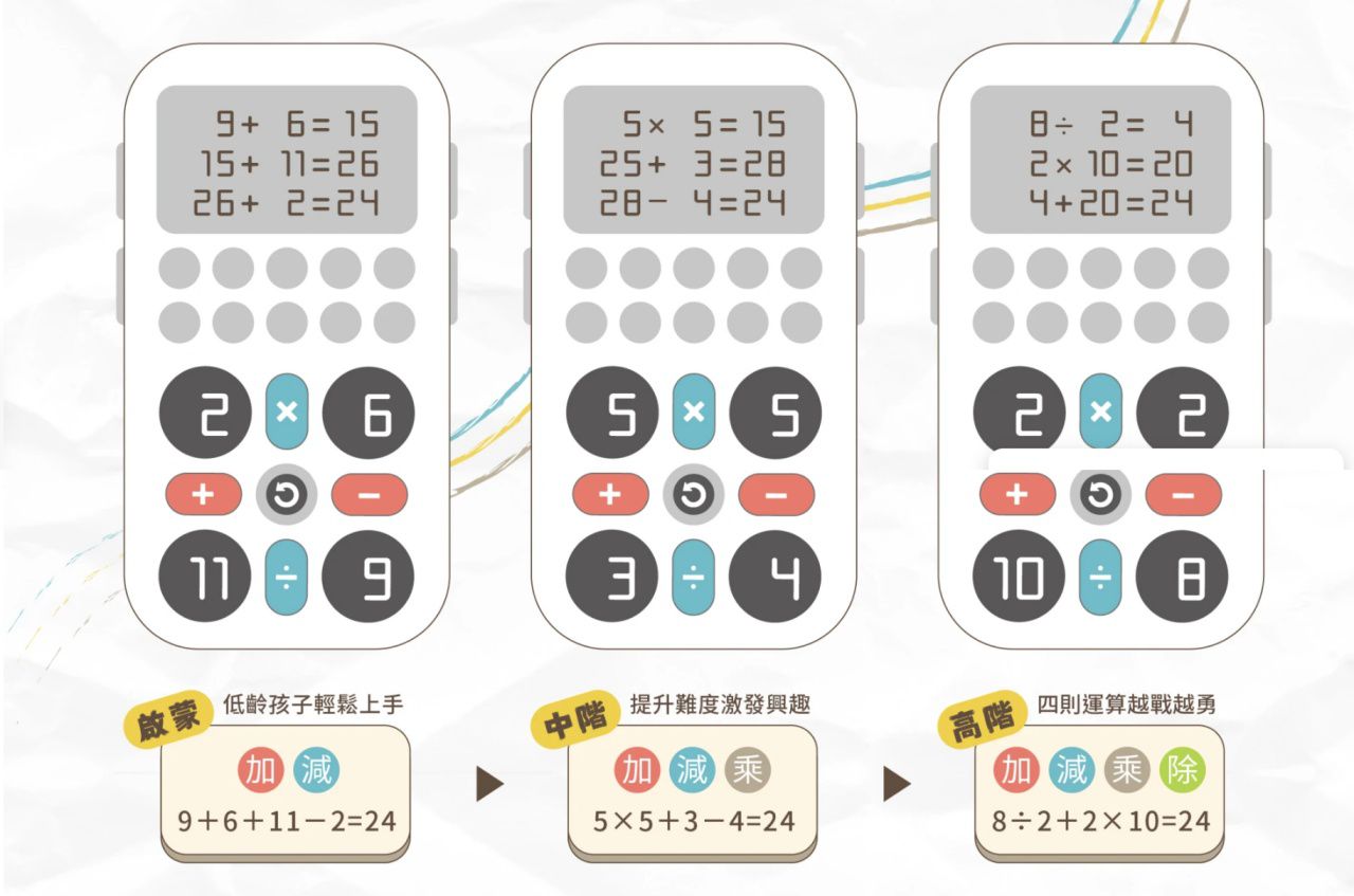 經典玩法升級再升級!『3、3、3、5』如何算出24點?考驗孩子的數感與反應力。