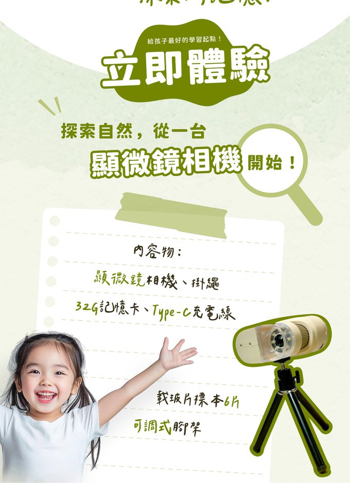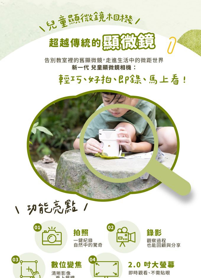 兒童STEAM顯微鏡相機是讓孩子動手探索世界的好幫手!將顯微鏡和相機合而為一:轉一轉焦距、按一下拍攝鍵,就能看到放大後的細節,還能拍照或錄影,操作簡易直覺性高,輕鬆上手💪