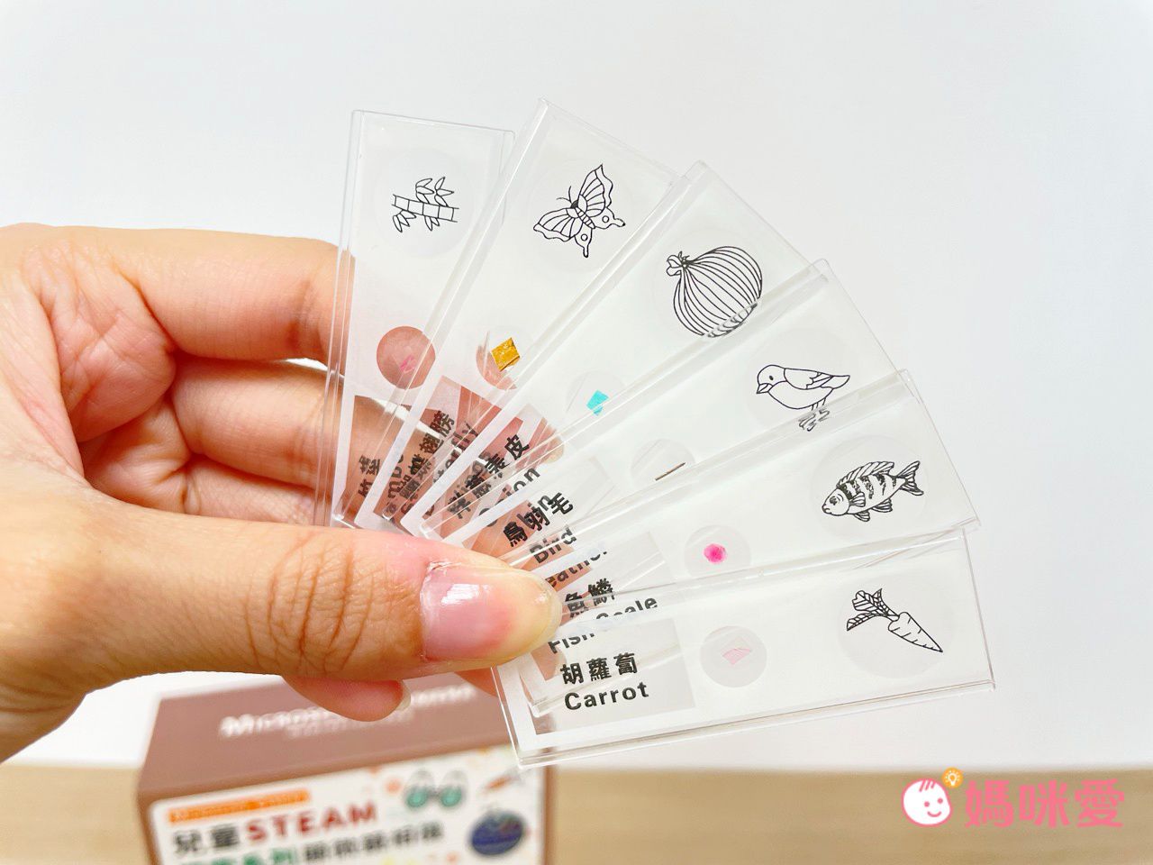 6個載玻片分別有:竹莖、蝴蝶翅膀、洋蔥表皮、鳥羽毛、魚鱗、胡蘿蔔。
