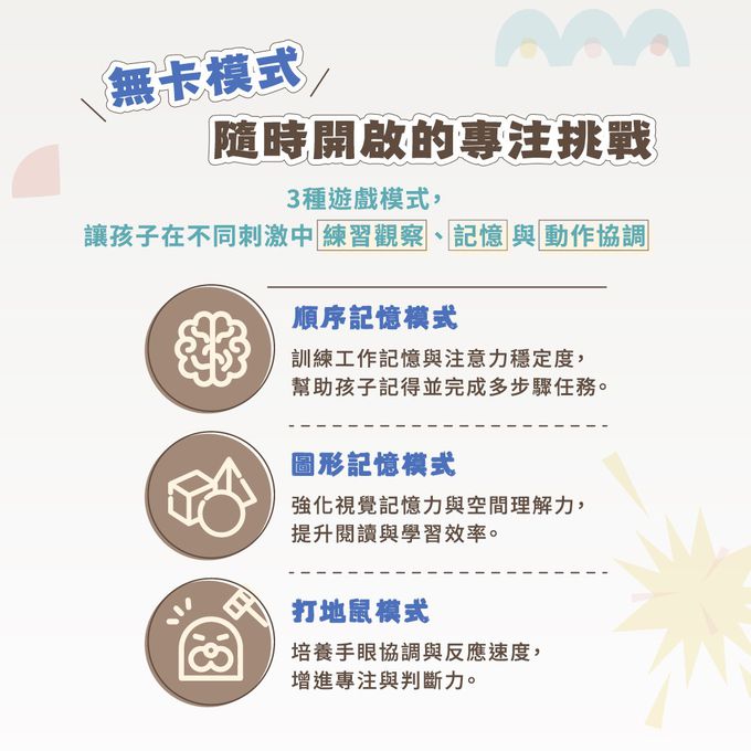 除了舒爾特模式,還有3種無卡遊戲模式(順序記憶、圖形記憶、打地鼠),讓孩子在不同刺激中練習觀察、記憶與動作協調