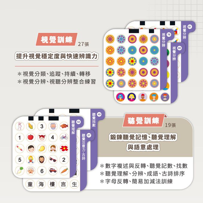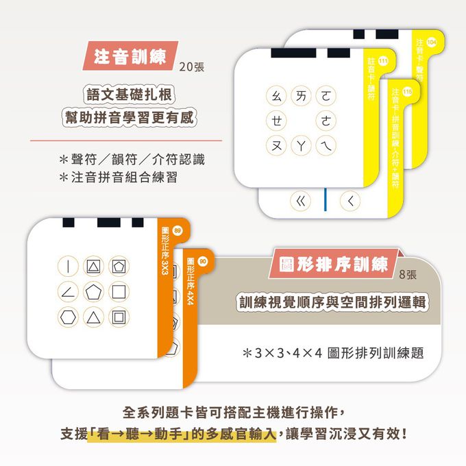 題卡類型有舒爾特訓練(強化邏輯推理與反應能力)、視覺訓練(提升視覺穩定度與快速辨識力)、聽覺訓練(鍛鍊聽覺記憶、聽覺理解與語意處理)、注音訓練(語文基礎扎根,幫助拼音學習更有感)、圖形排序訓練(訓練視覺順序與空間排列邏輯)