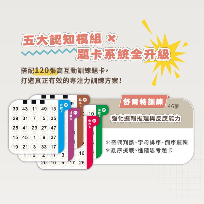 搭配120張高互動訓練題卡(獨家設計注音題型,幫助幼小銜接),打造真正有效的專注力訓練方案!(附專屬攜行盒收納卡片,外出攜帶好方便)