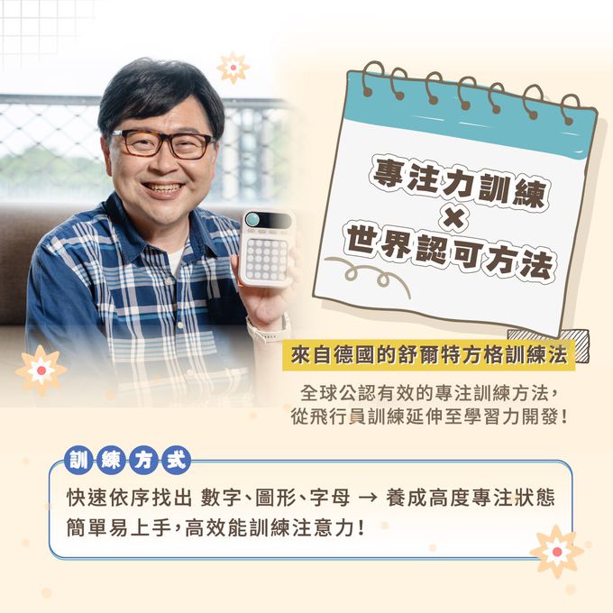 這台專注力訓練機結合德國精神暨心理學家舒爾特所設計、全球公認有效的舒爾特方格訓練法💡過遊戲化的方式,幫助孩子強化專注力×記憶力×邏輯力,讓學習更有效率!