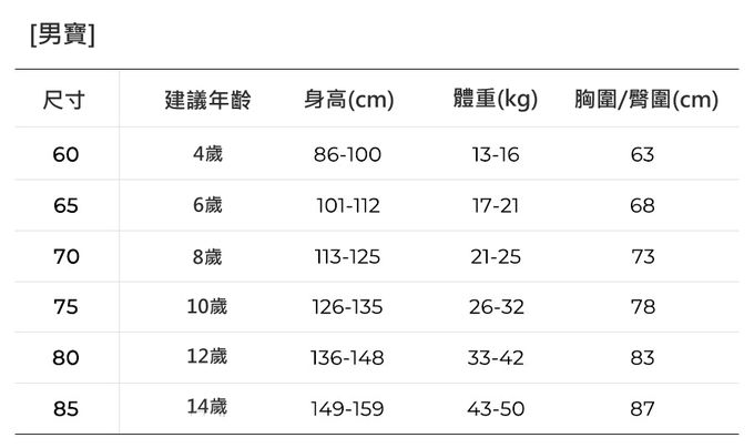 • 若 13 歲以上青少年穿童裝 85 號覺得偏小,也可改穿成人 S 號